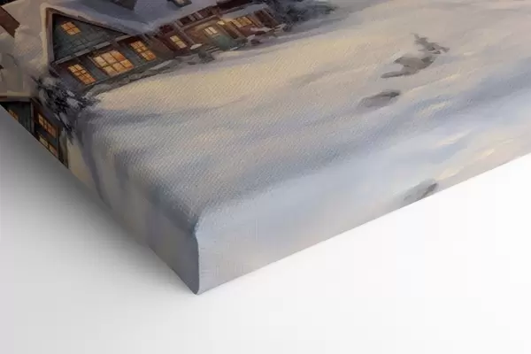 Schilderij Zonsondergang in het winterdorp, rustiek, aquarel, sneeuwvlokken Art. s41386