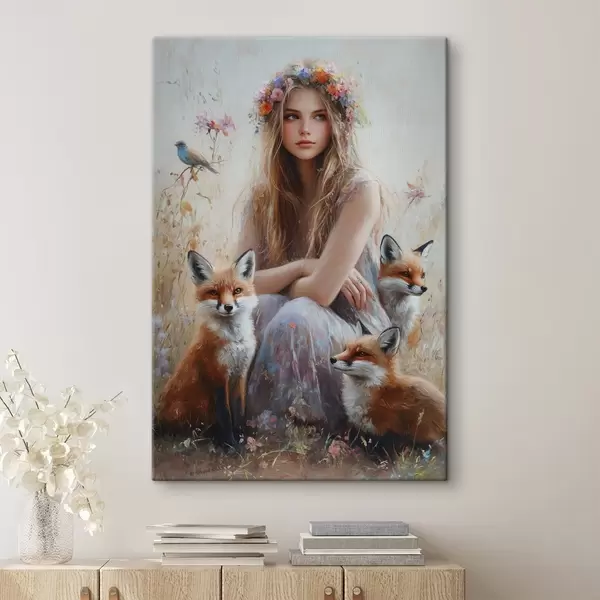 Schilderijen Meisje in de wei, wilde dieren, vossen, vogels, bloemenkrans s41451