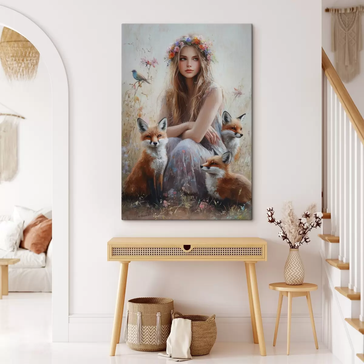 Schilderij Meisje in de wei, wilde dieren, vossen, vogels, bloemenkrans Art. s41451