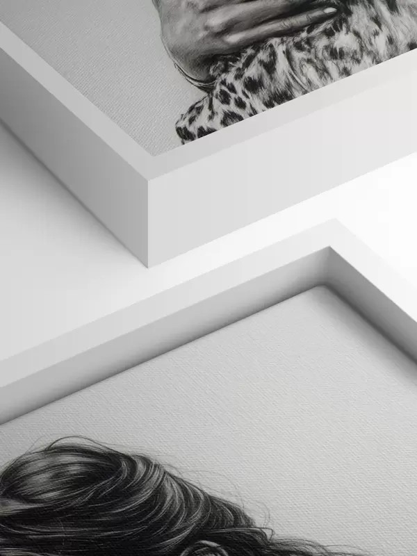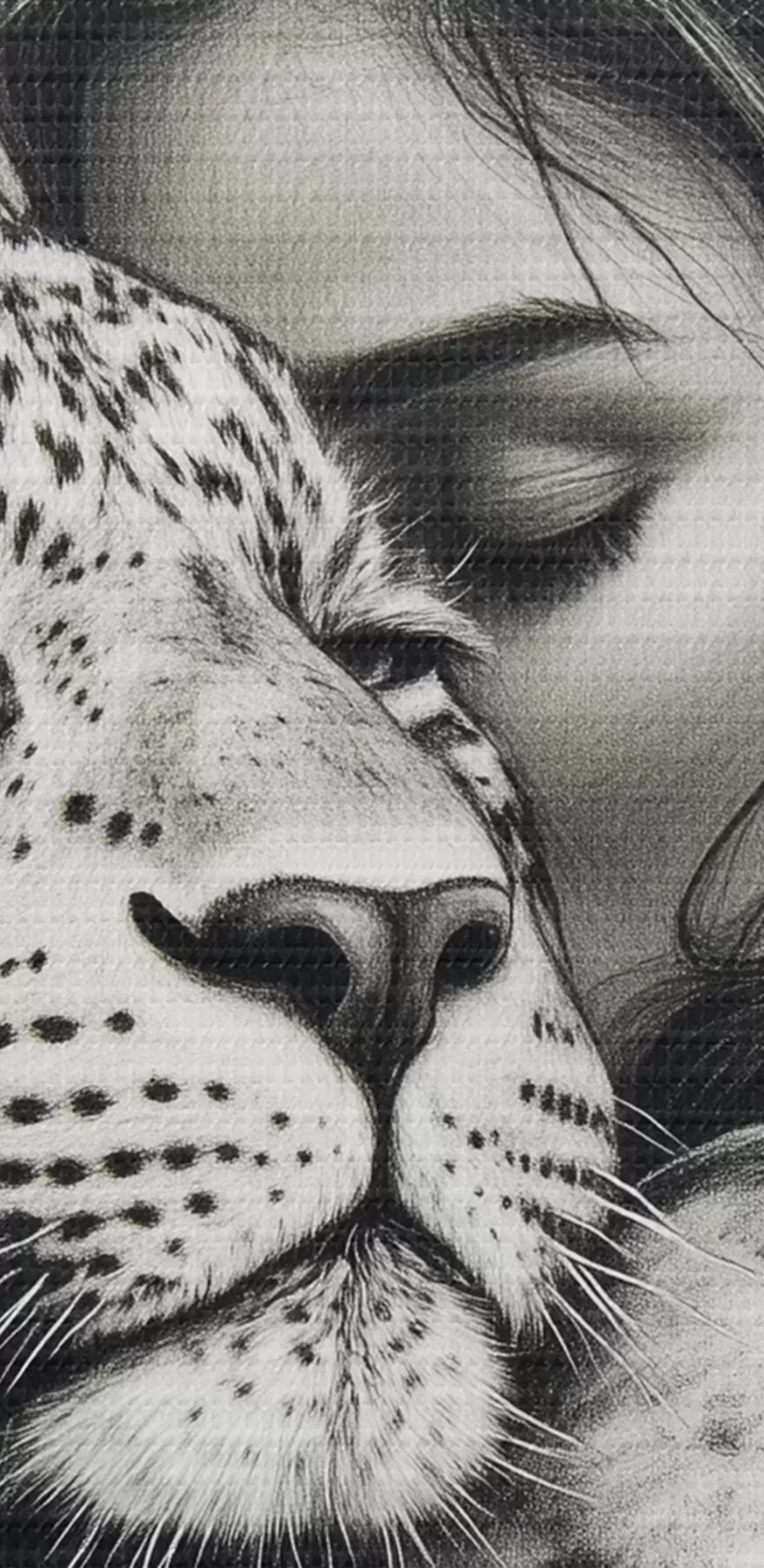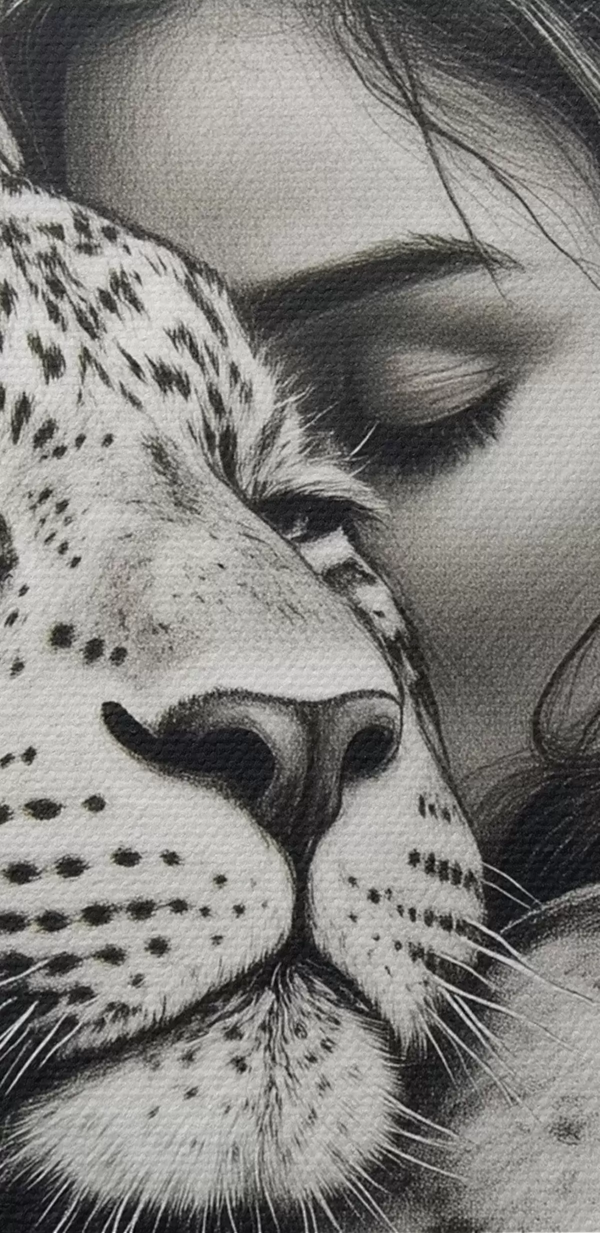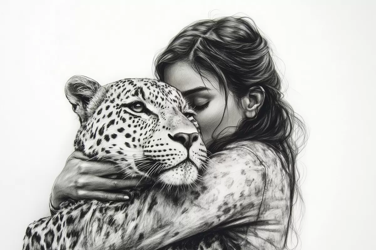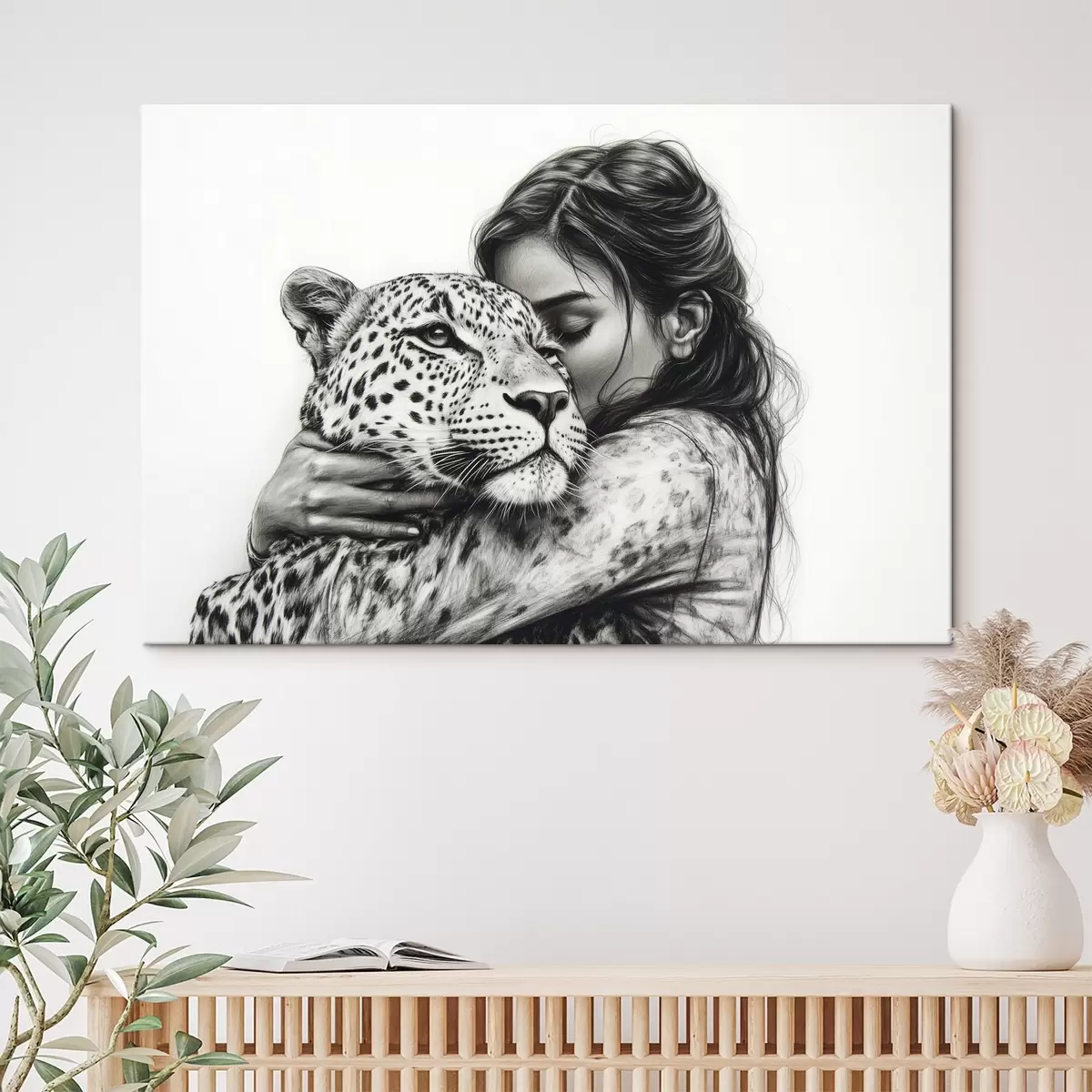 Schilderij Vrouw met luipaard, wilde dieren, potloodtekening, zwart-wit Art. s41455