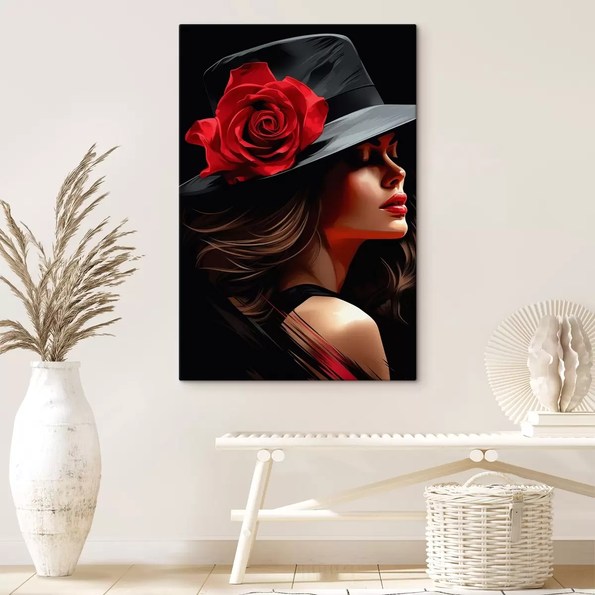 Schilderij Illustratie meisje in een hoed met een mooie chique roos Art. s41546