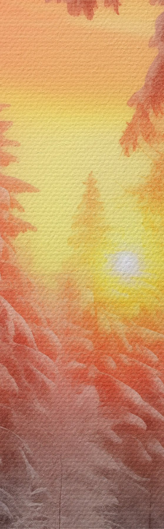 Schilderijen Een pad in het winterse bos, sneeuw, dennenbomen, kleuren van zonsondergang s41639