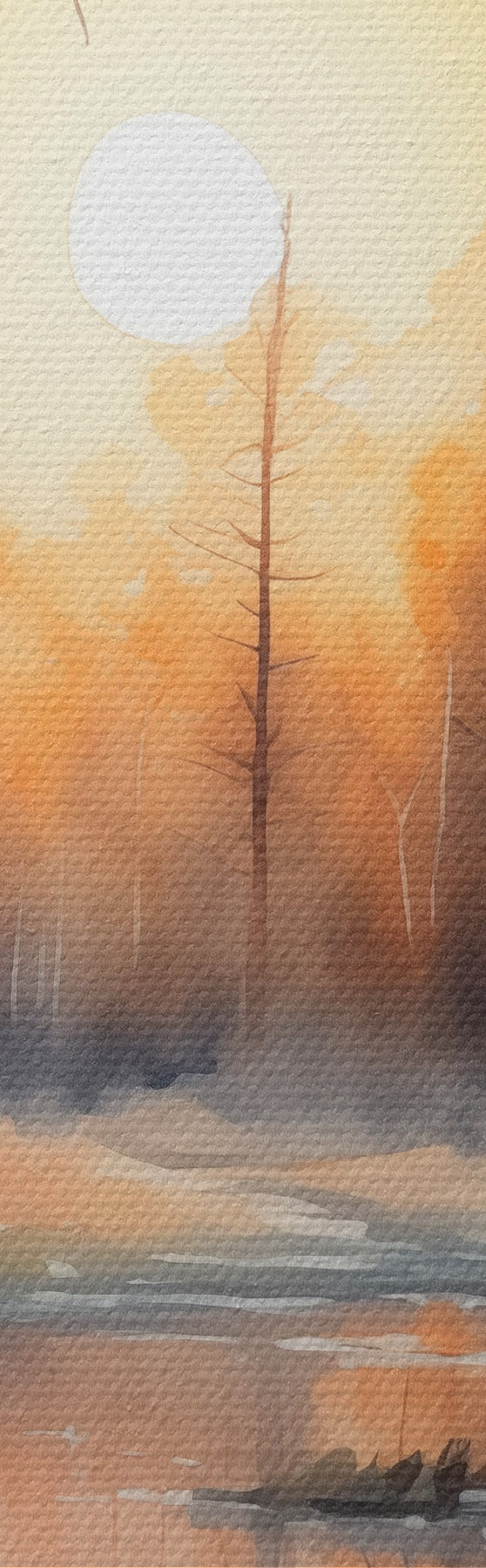 Schilderijen Meer in het bos, aquarel, herfstkleuren, mist, zonsondergang lucht s41642