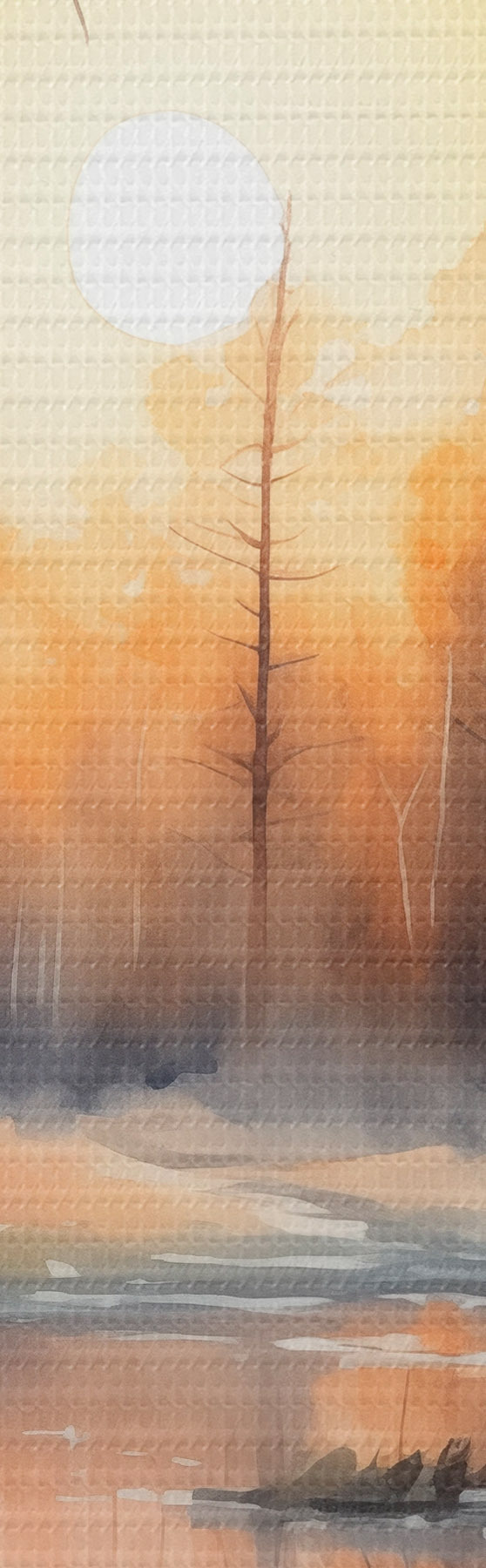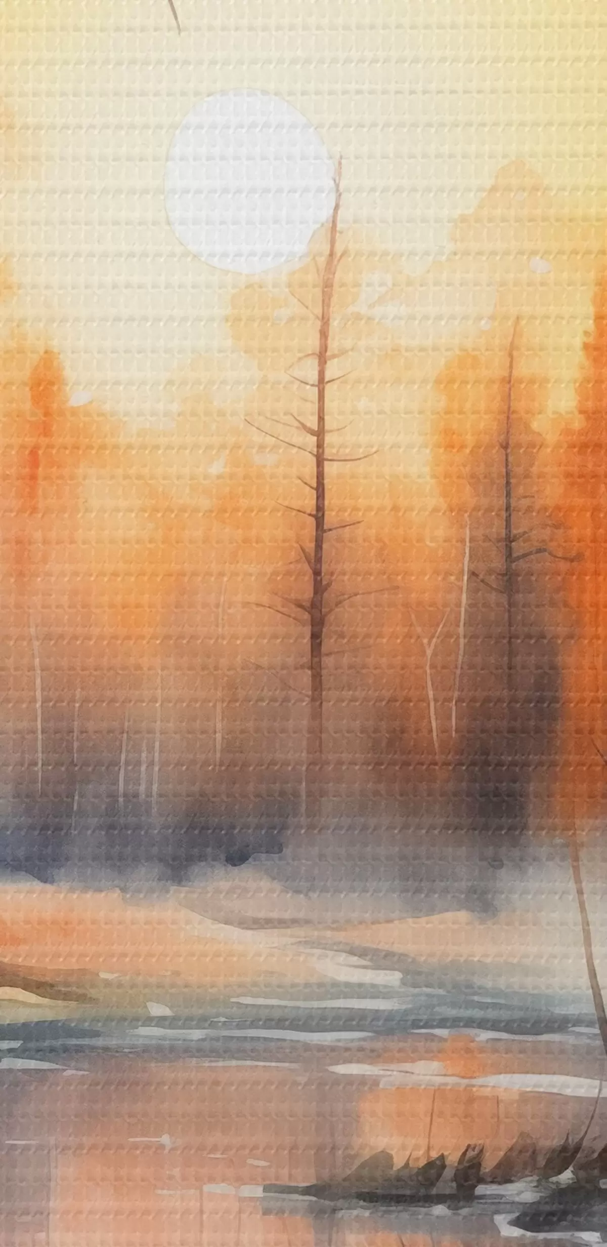 Schilderij Meer in het bos, aquarel, herfstkleuren, mist, zonsondergang lucht Art. s41642