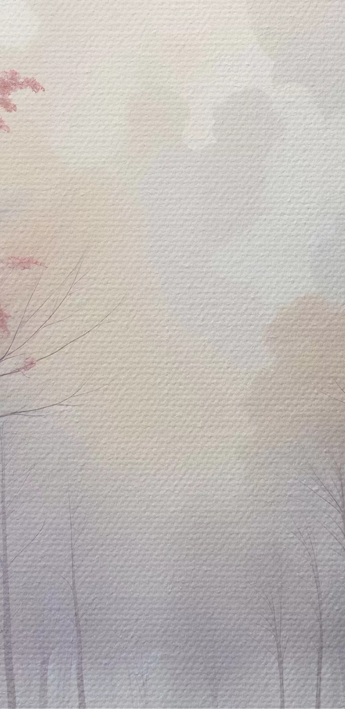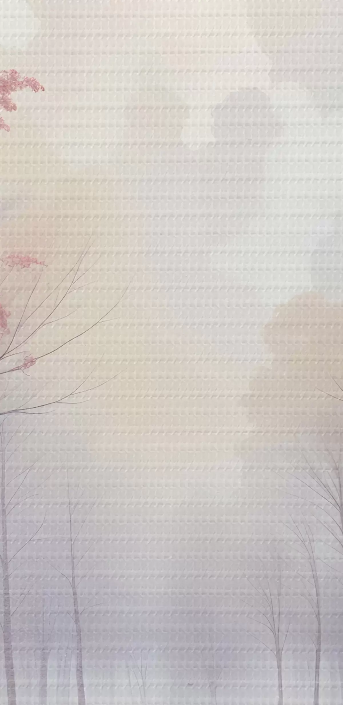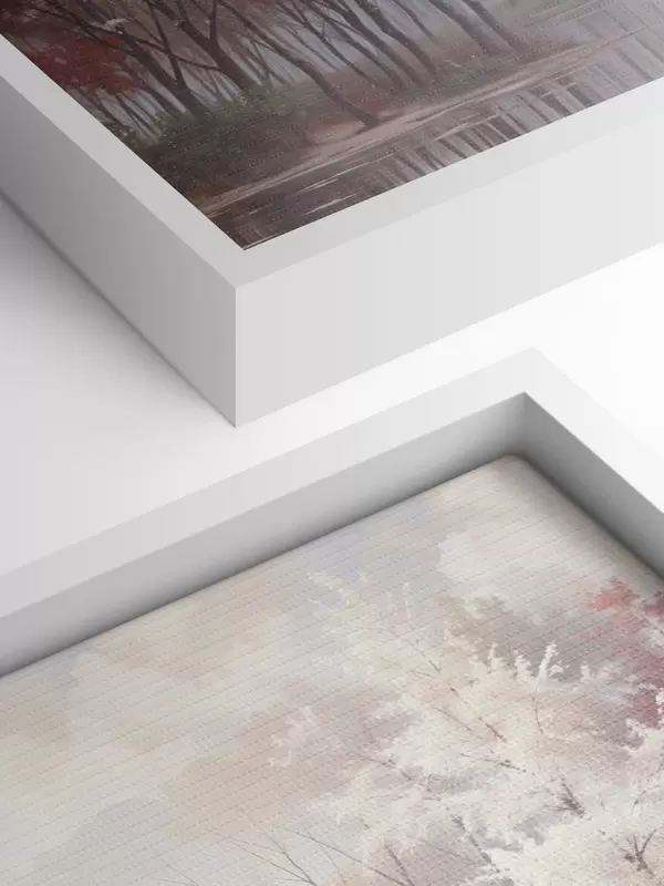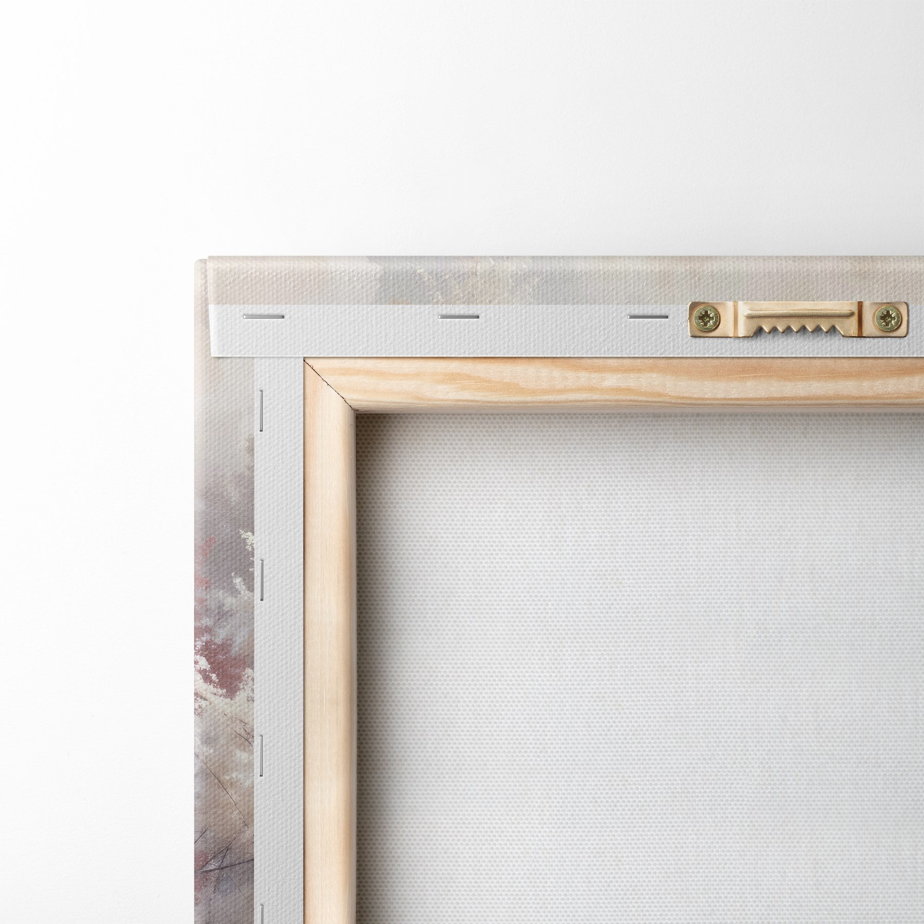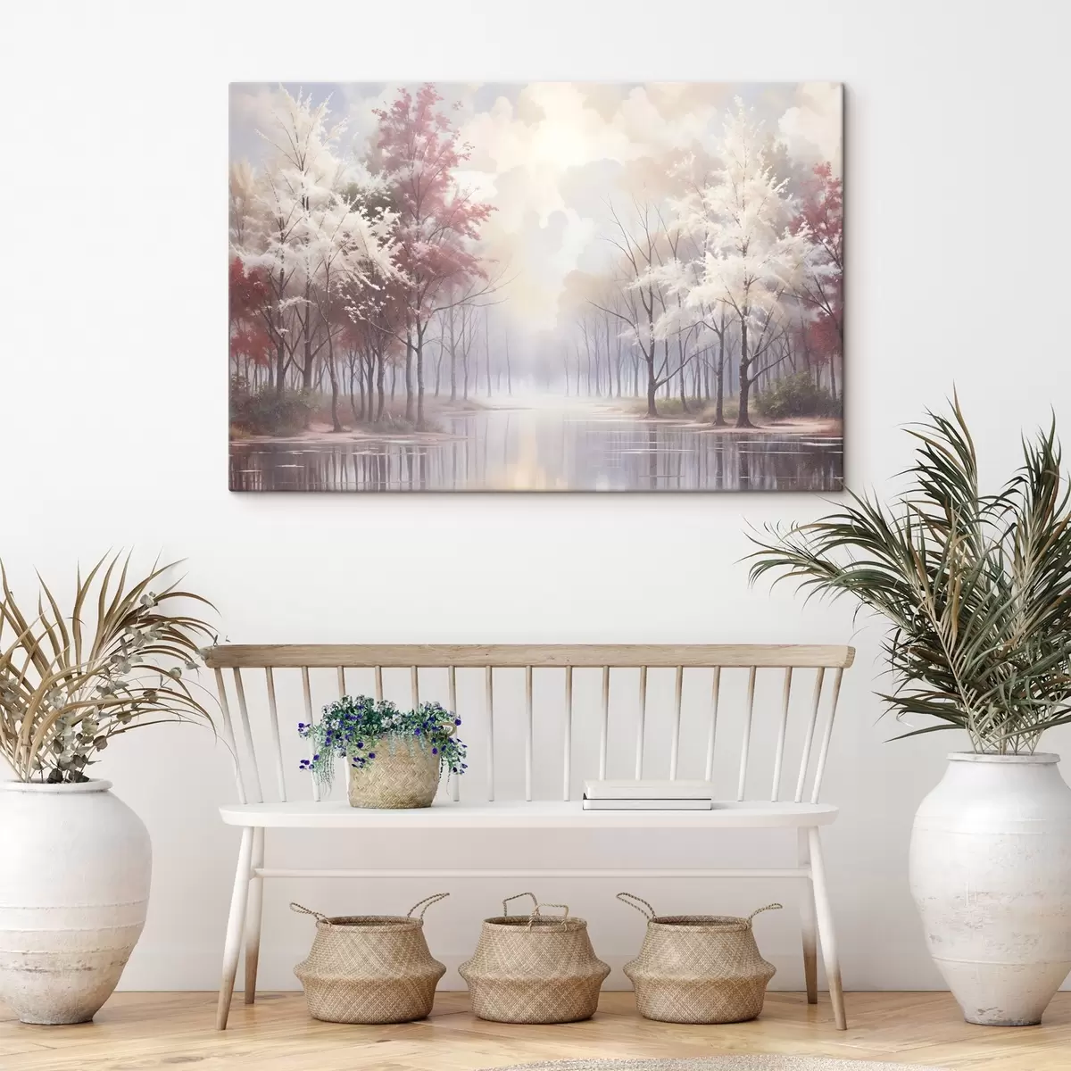Schilderij Een sereen landschap met een mistig bos, kale bomen en een kalm meer dat de zachtroze en witte tinten weerspiegelt Art. s41720
