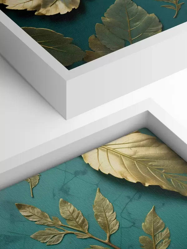 Schilderijen Gele delicate bladeren op een groenblauwe achtergrond, voor een elegante botanische print s41727