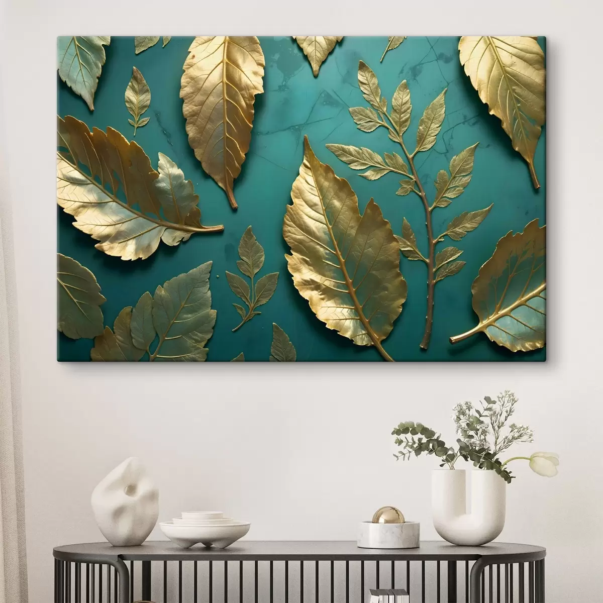 Schilderij Gele delicate bladeren op een groenblauwe achtergrond, voor een elegante botanische print Art. s41727