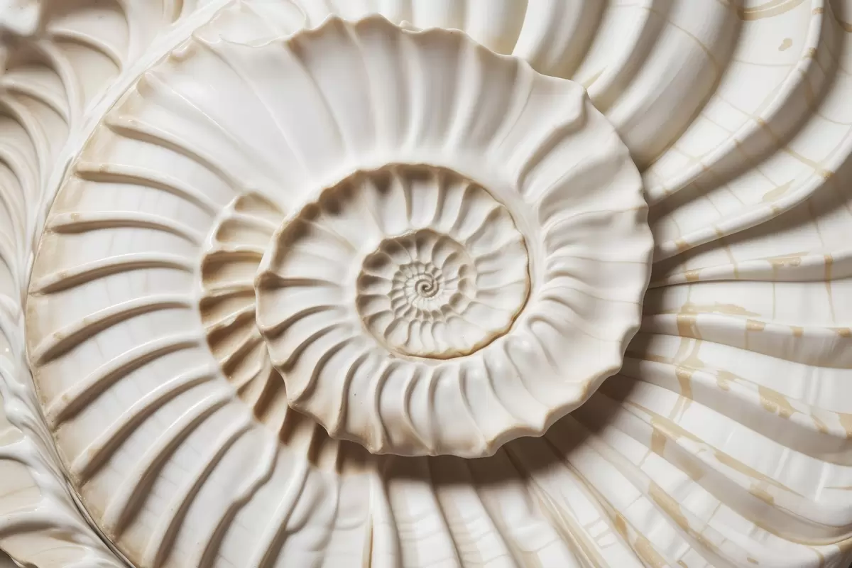 Schilderij Witte spiraalvormige schelp, met ingewikkeld en gedetailleerd patroon Art. s41728