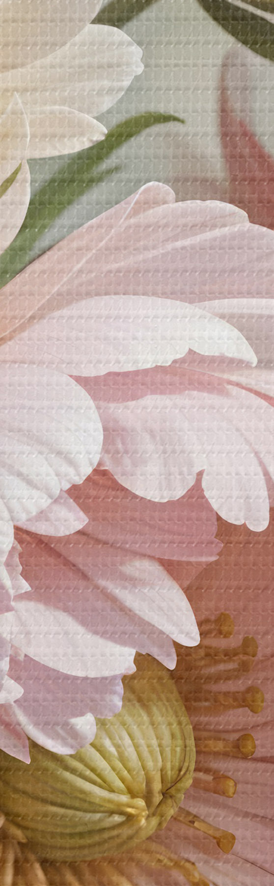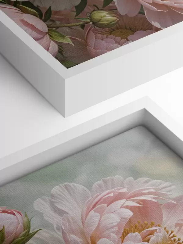 Schilderij Verschillende grote, weelderige pioenbloemen met delicate bloemblaadjes in roze en witte tinten Art. s41729