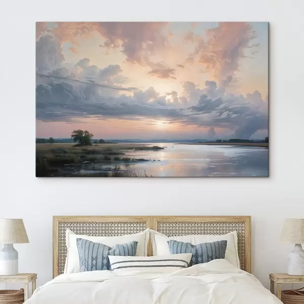 Schilderij Een sereen pastelkleurig landschap met een kalm meer dat de kleurrijke lucht weerspiegelt bij zonsondergang Art. s41734