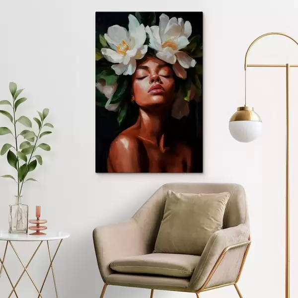 Schilderij Een vrouwenportret met witte bloemen in haar haar op een donkere achtergrond Art. s41824