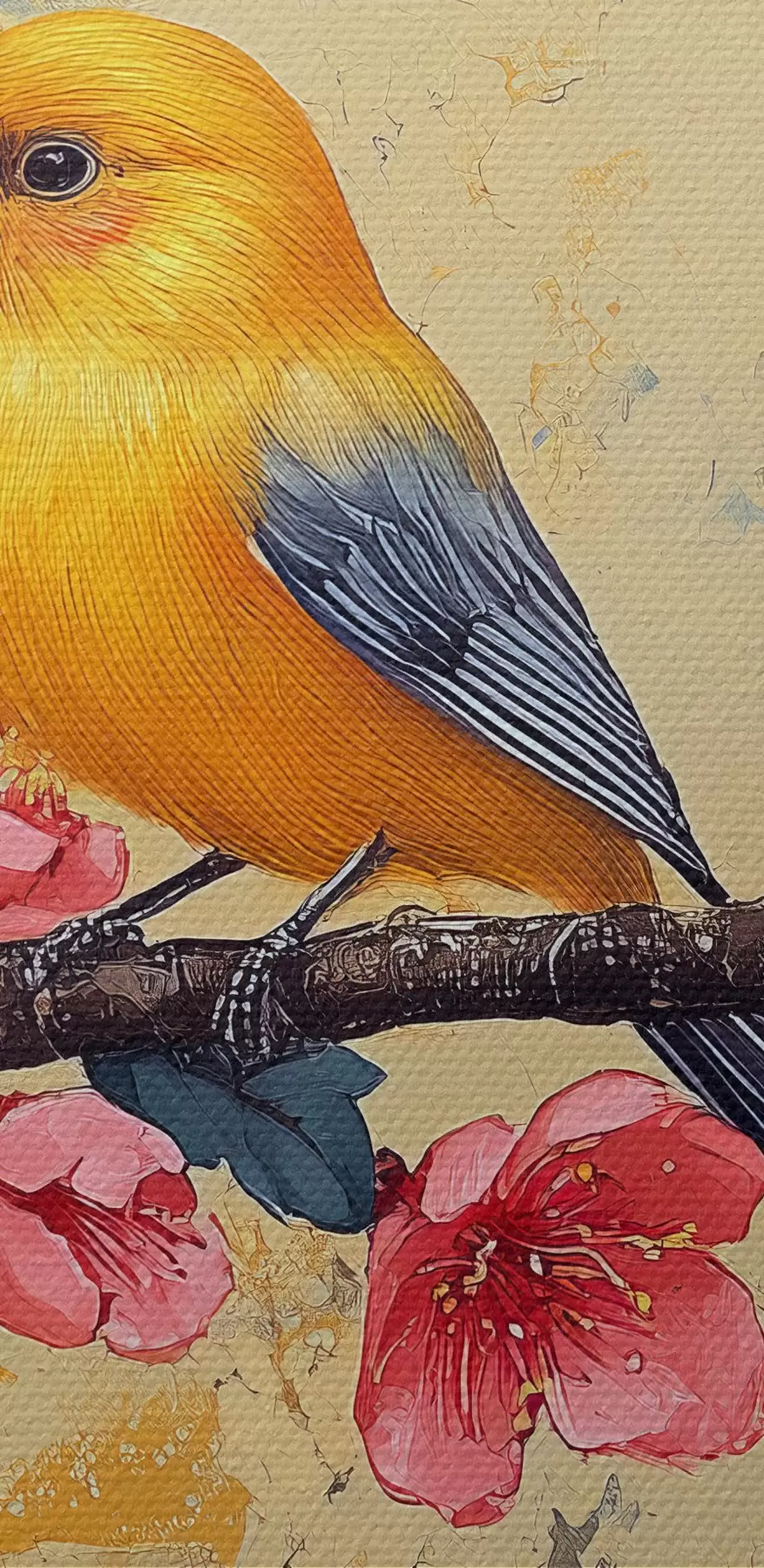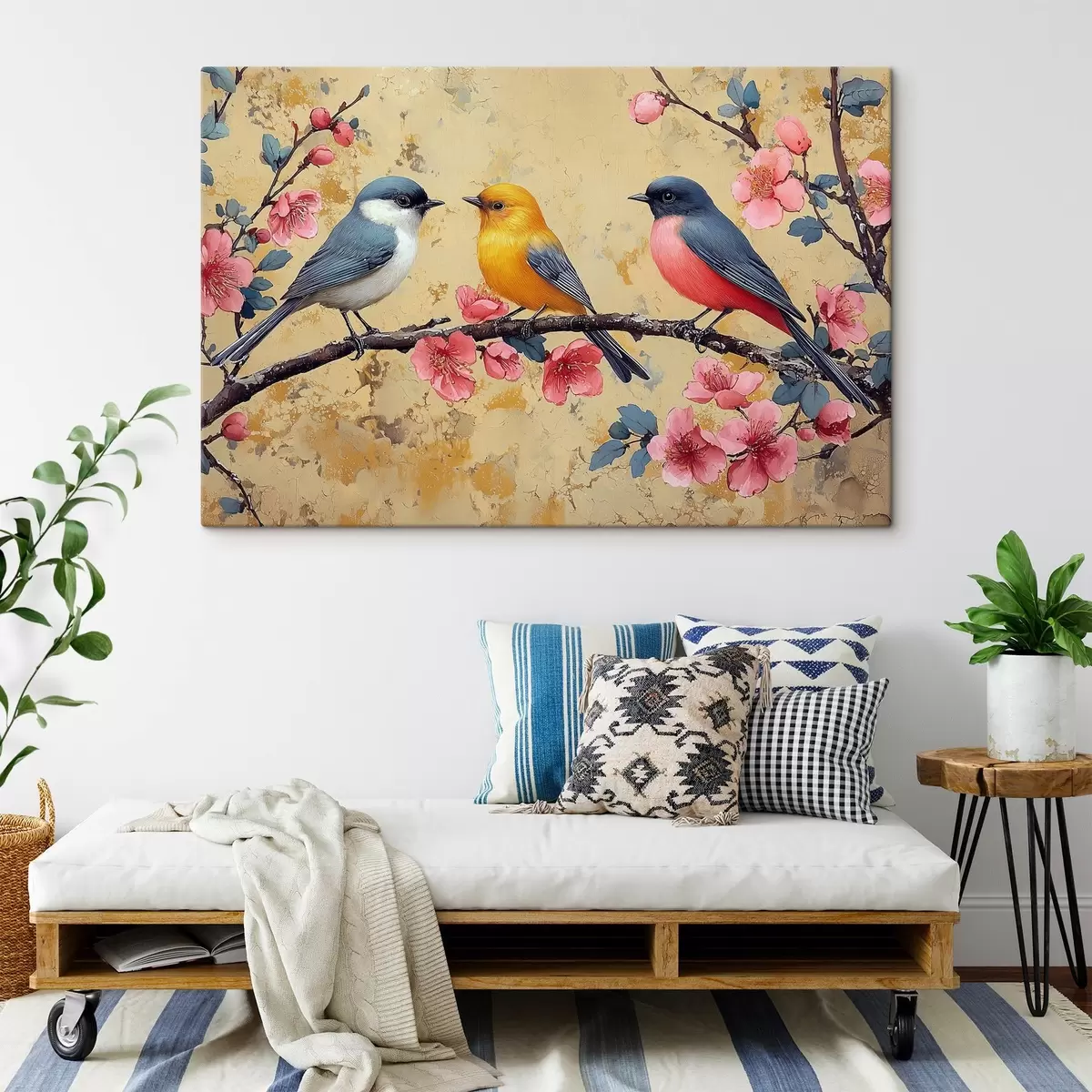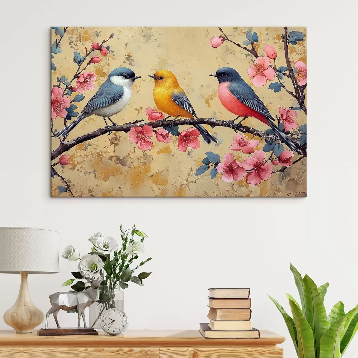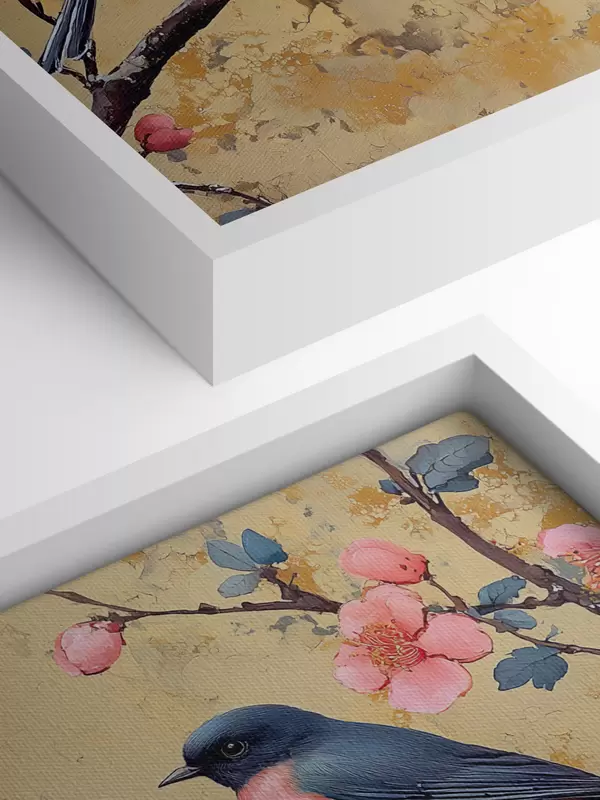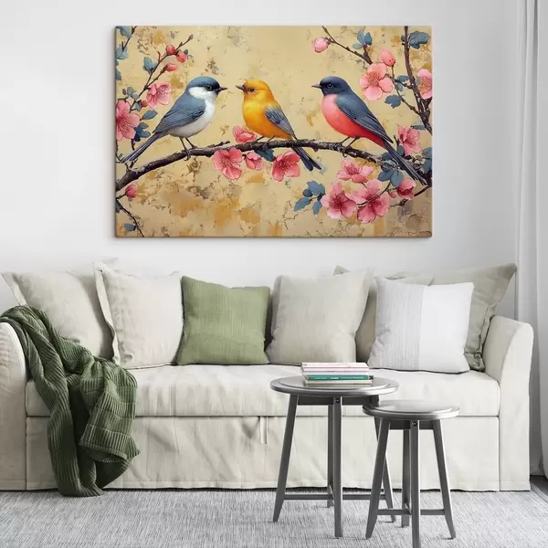 Schilderij Mussen op een tak van sakura in de stijl van olieverfschilderij Art. s41835