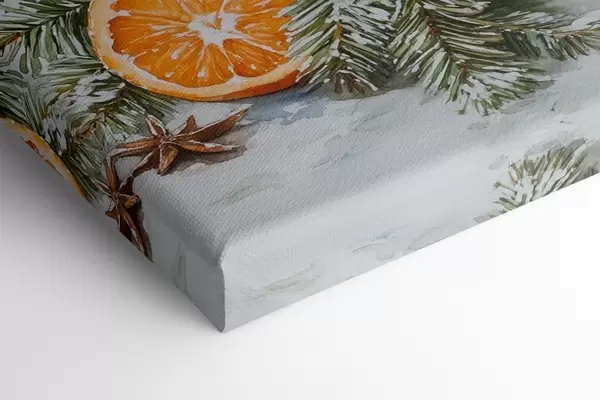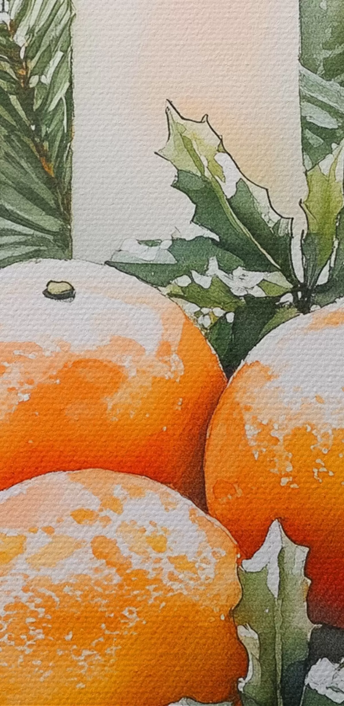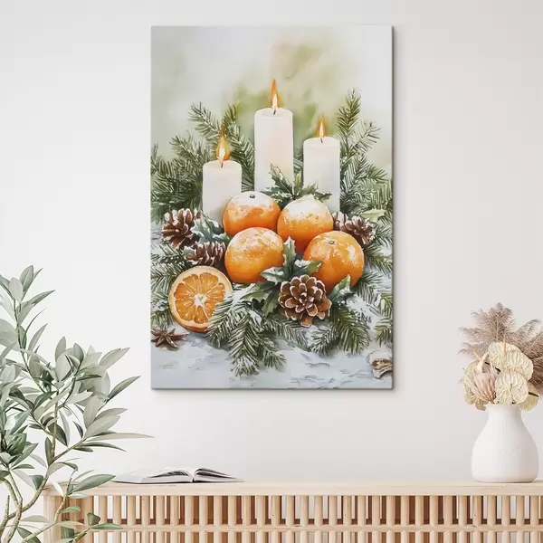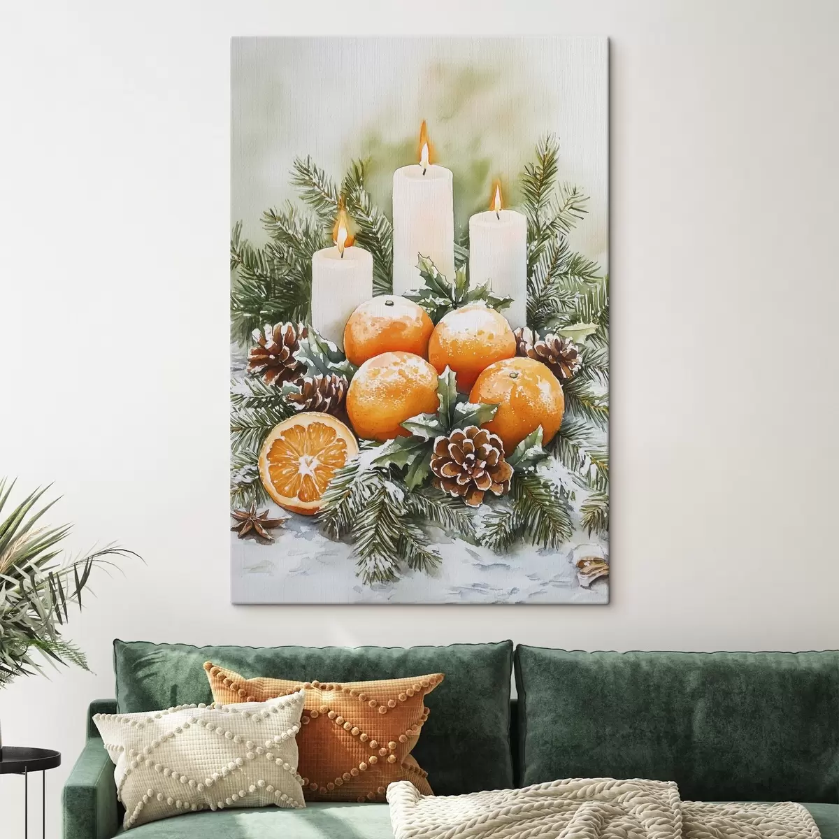 Schilderij Kerstdecor met kaarsen, dennenboom, dennenappels en sinaasappels, aquarelstijl Art. s41951