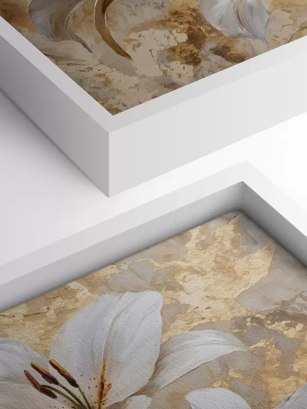 Schilderijen Witte lelies met gele harten tegen een beige achtergrond met textuur s42216