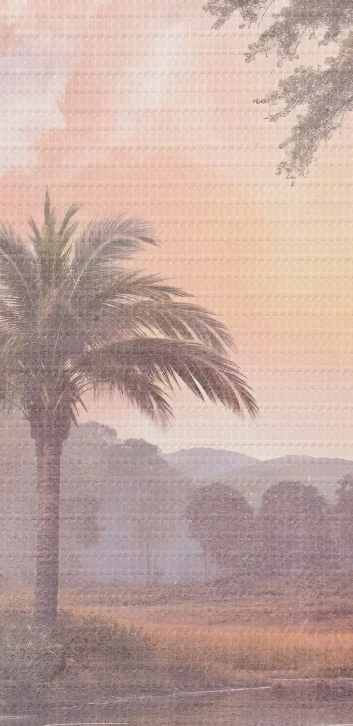Schilderij Een tropisch landschap met een sereen meer omringd door weelderige palmbomen en ander gebladerte Art. s42219
