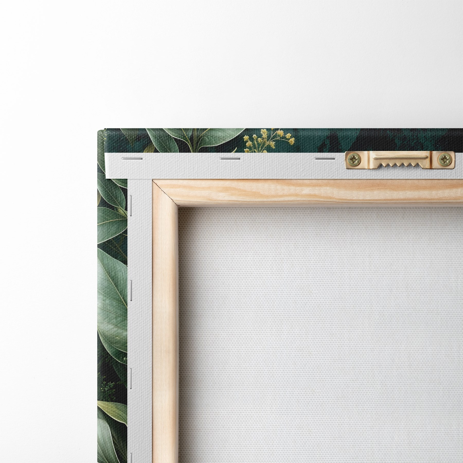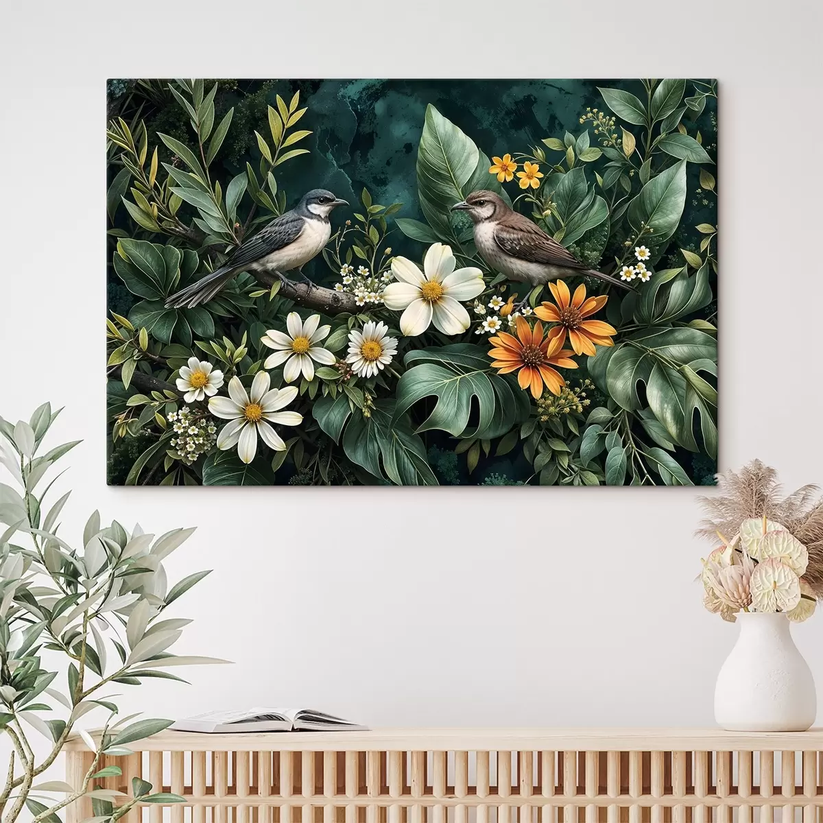 Schilderij Kleine vogels zitten op takken omringd door weelderig tropisch gebladerte, inclusief grote groene bladeren en kleurrijke bloemen Art. s42220