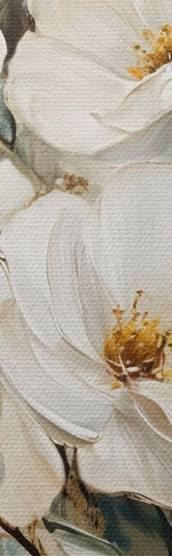 Schilderij Een boeket grote witte bloemen in olieverfstijl met gele harten tegen een lichte achtergrond Art. s42222