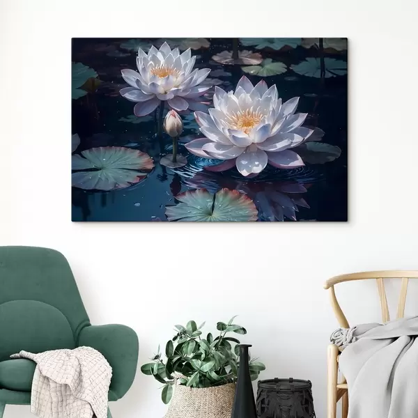Schilderij Witte lotusbloemen drijvend op een kalme vijver met lelieblad Art. s42225