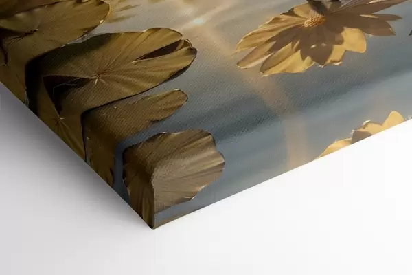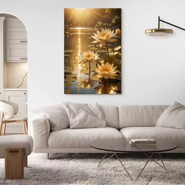 Schilderij Witte lotusbloemen drijven op een kalme vijver met de zon, waardoor een serene en rustige sfeer ontstaat Art. s42239