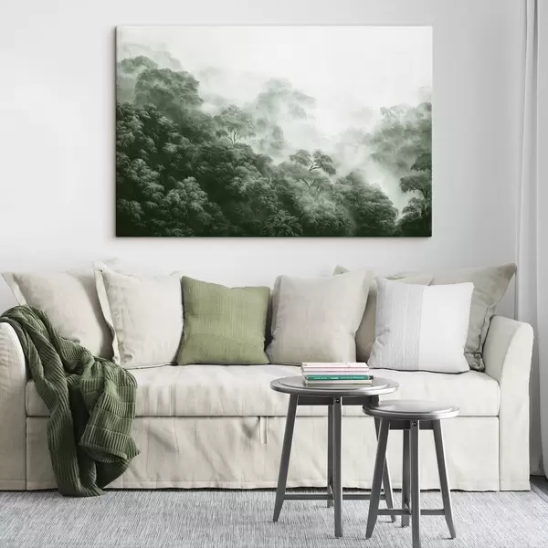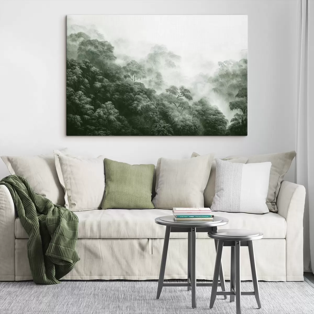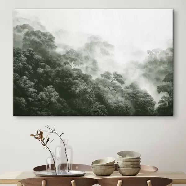 Schilderij Tropisch bos in de mist, palmbomen, groene kleuren Art. s42371