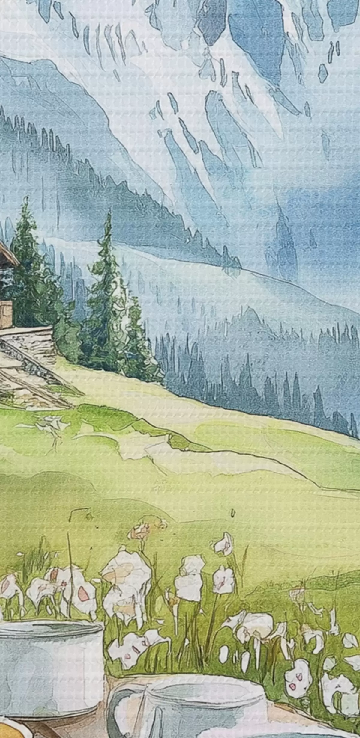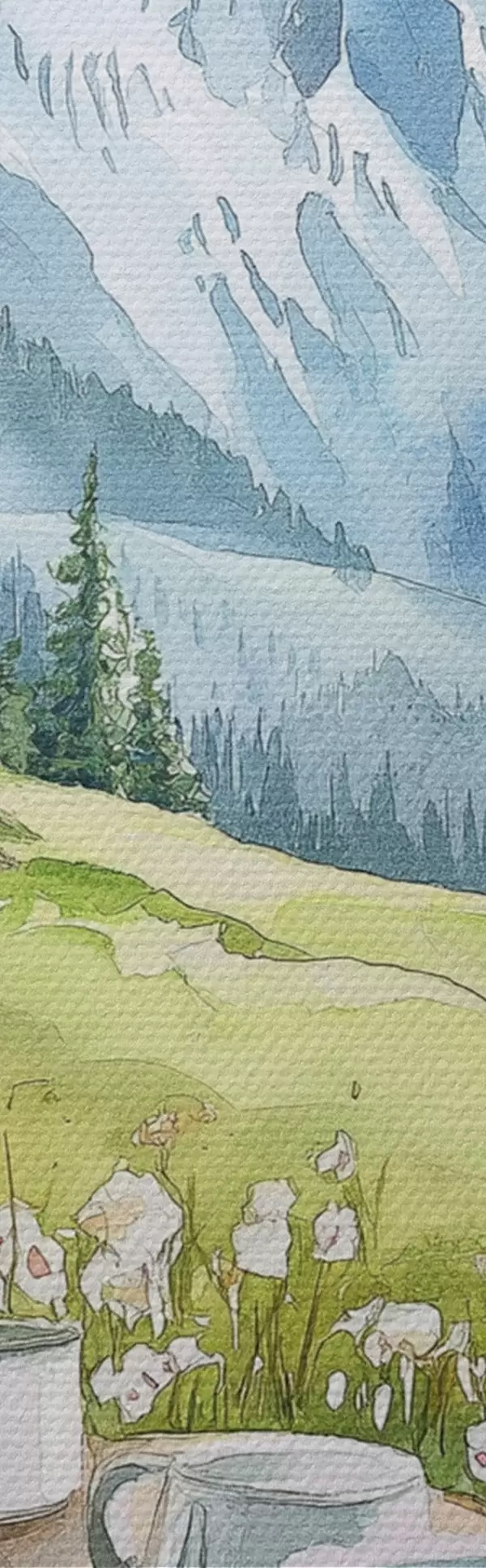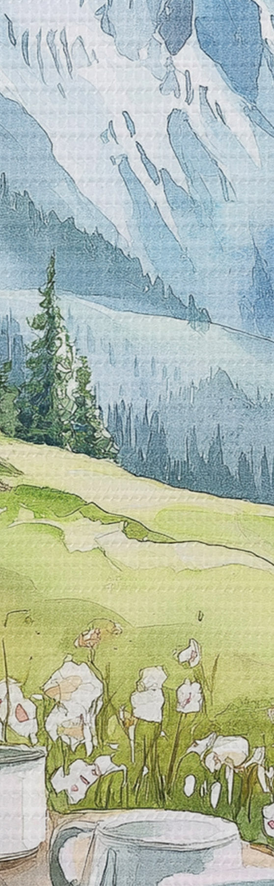 Schilderij Ontbijt in de Alpen, bergen, bos, natuur, zomer, aquarel stijl Art. s42426