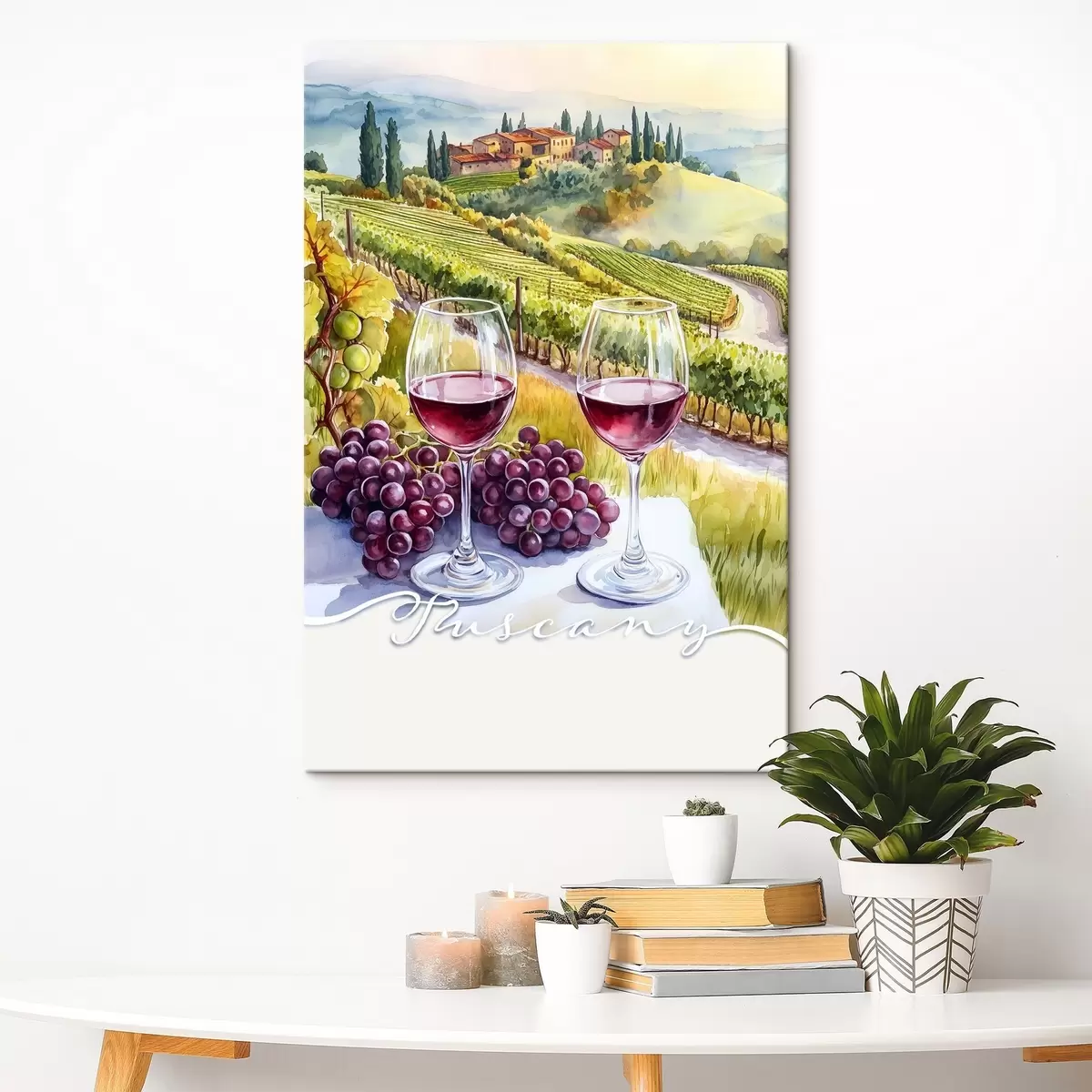 Schilderij Tuscany landschappen, aquarel stijl, wijnglazen, druiven, zonsondergang Art. s42439