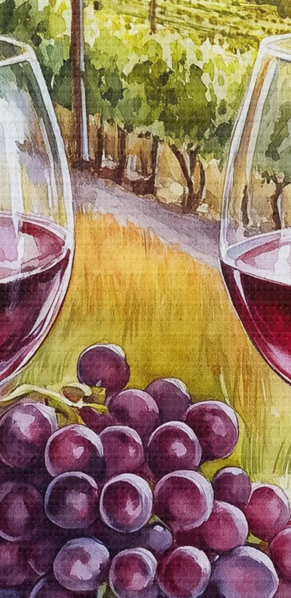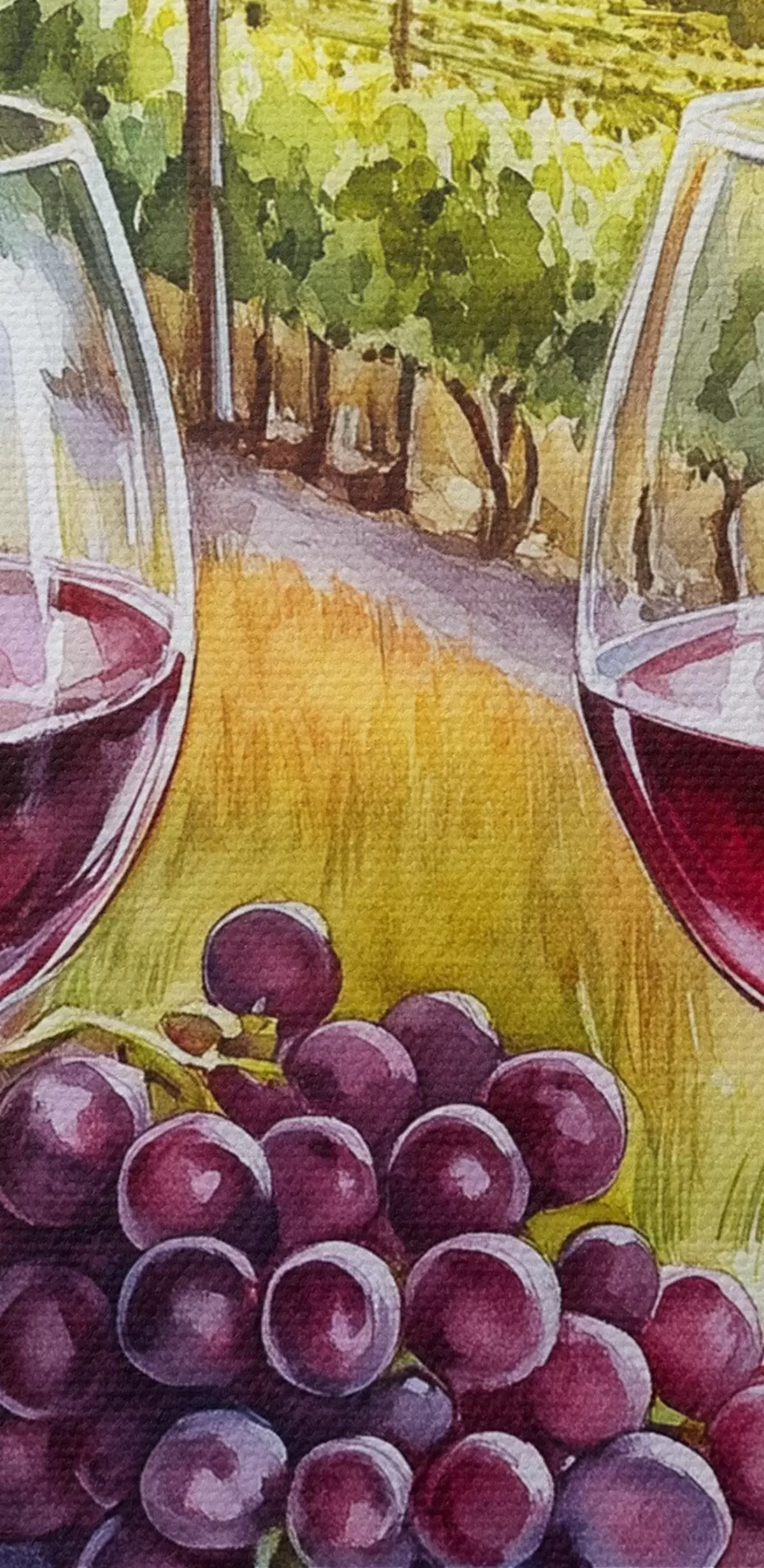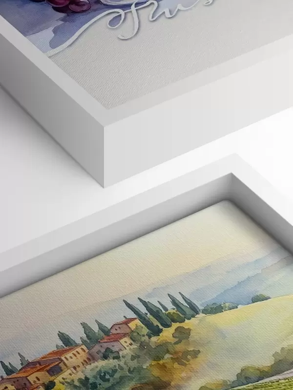 Schilderijen Tuscany landschappen, aquarel stijl, wijnglazen, druiven, zonsondergang s42439