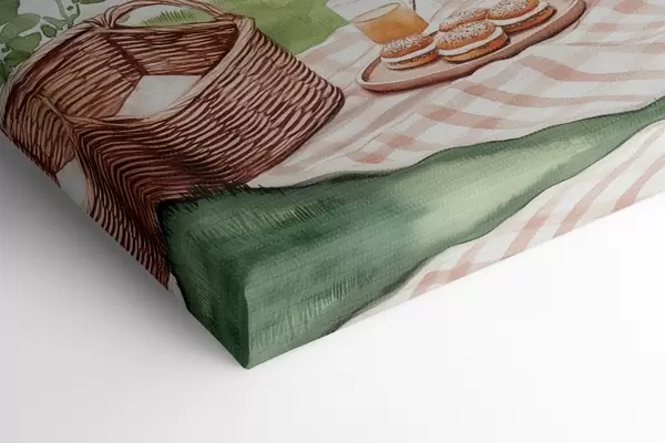 Schilderij Zomerse picknick in aquarelstijl, rustiek, meer, groen, voedselmanden Art. s42452