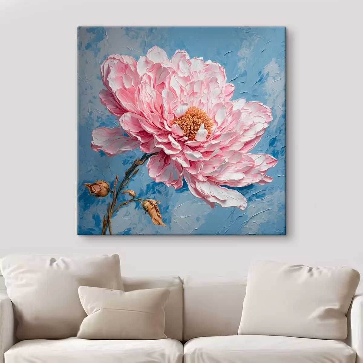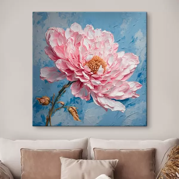 Schilderij Roze bloem op blauwe achtergrond in olieverfschilderijstijl Art. s42537