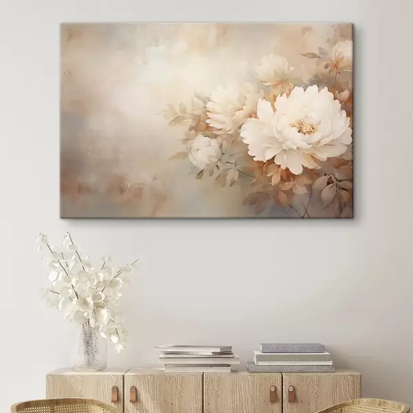 Schilderijen Delicate pioenrozen in pastelkleurige crèmetinten op een onscherpe achtergrond, die een zachte en romantische sfeer creëert. s42558