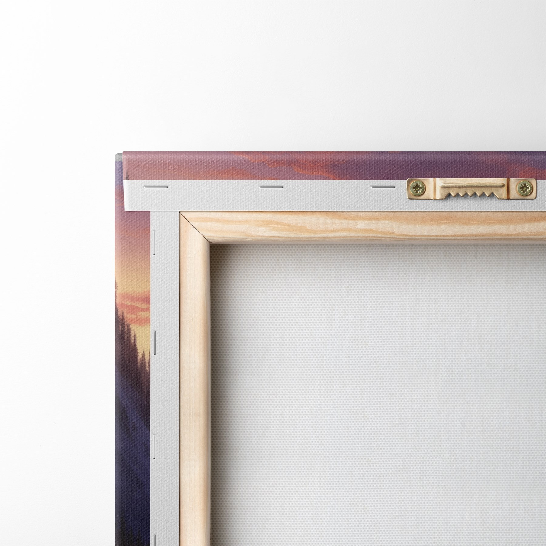 Schilderij Een adembenemend berglandschap bij zonsondergang met besneeuwde toppen, donkere dennenbomen en zachte roze-paarse tinten in de lucht. Art. s42566