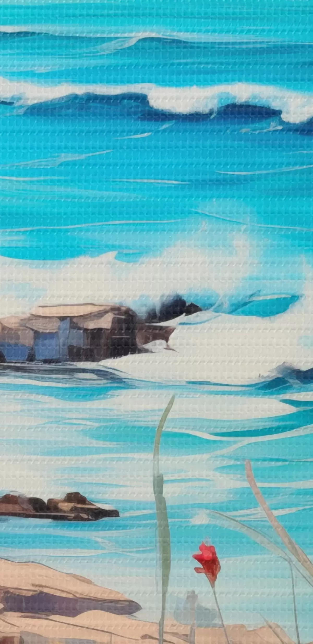 Schilderij Een zeegezicht met turquoise golven, een rotsachtige kust en heldere bloemen op de voorgrond onder een helderblauwe hemel. Art. s42568