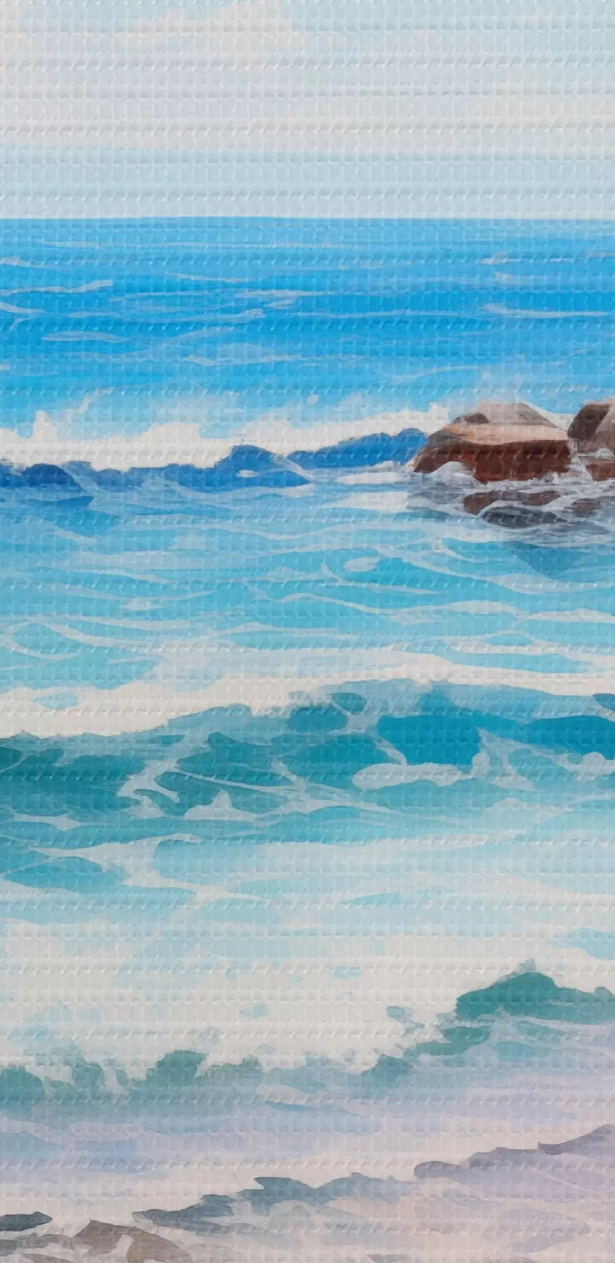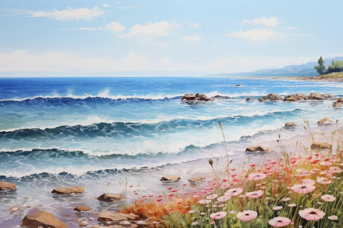 Schilderij Een uitzicht op zee met turquoise golven, een kiezelstrand en delicate roze bloemen op de voorgrond onder een heldere hemel. Art. s42569
