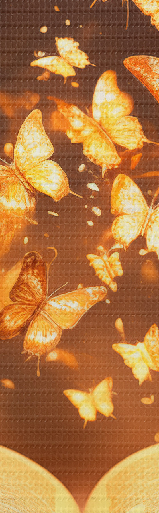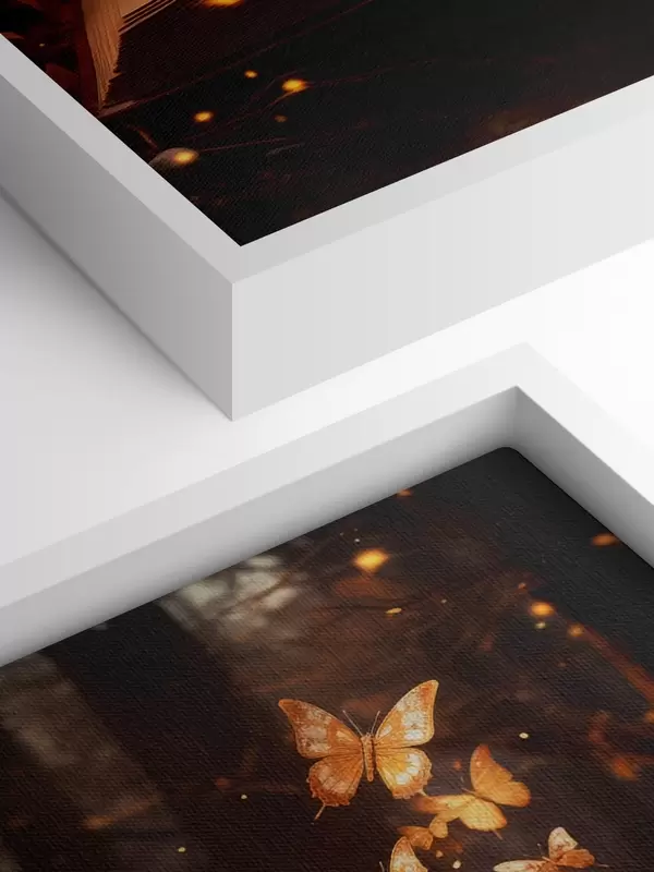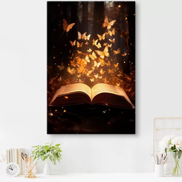 Schilderij Een open boek waaruit lichtgevende vlinders tevoorschijn komen, stralend in lichtstralen in een donker, magisch bos. Art. s42573