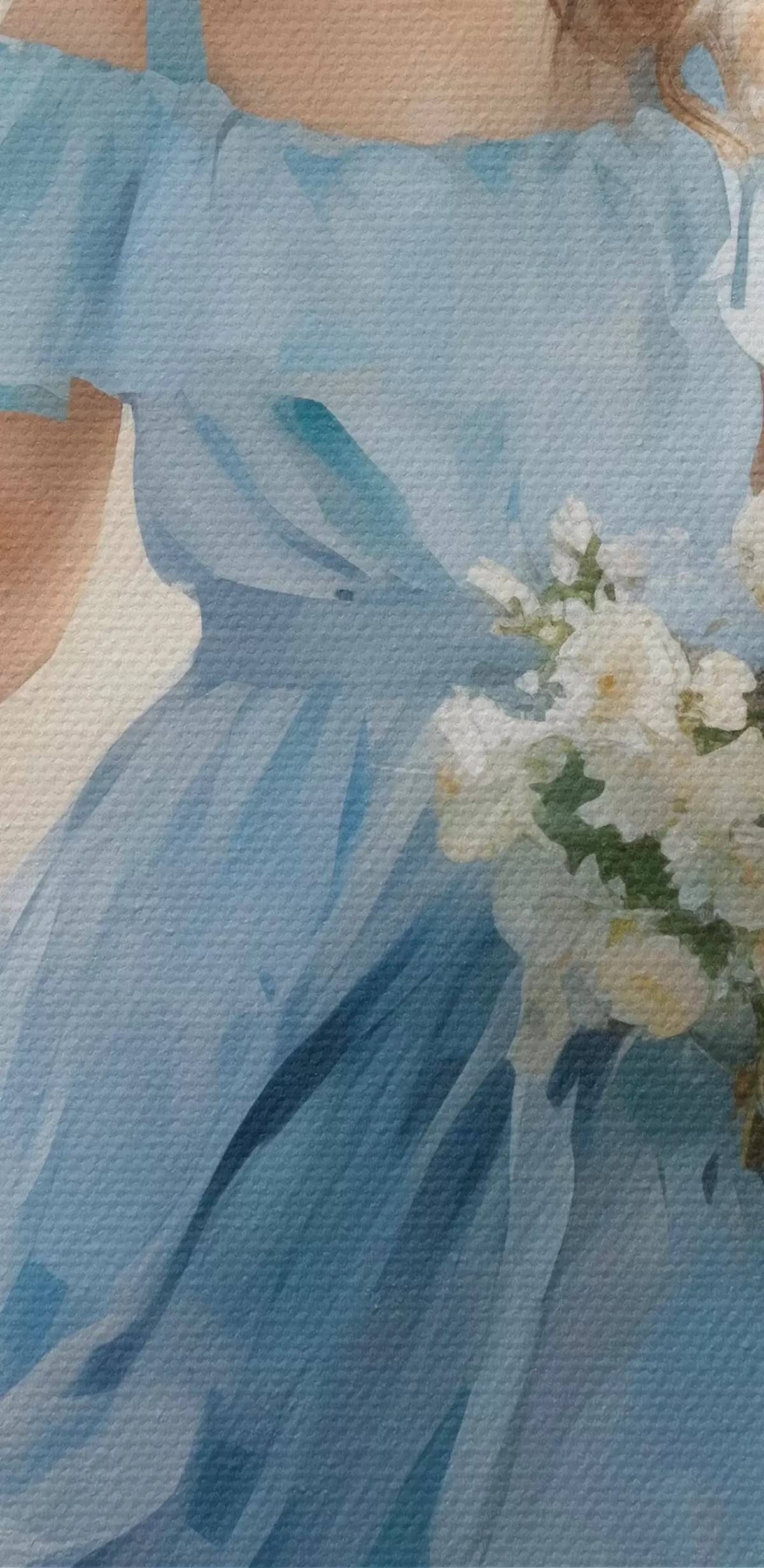 Schilderij Een elegant meisje in een lichtblauwe jurk en hoed wandelt door de stad, met een boeket bloemen in de hand, in een lichte en romantische stemming. Art. s42580
