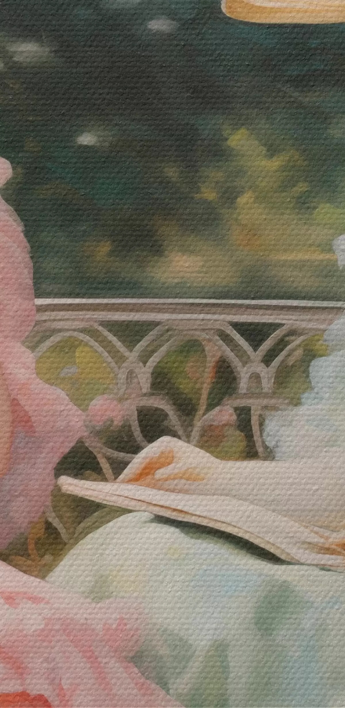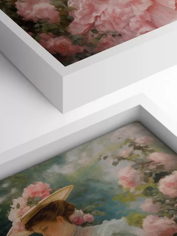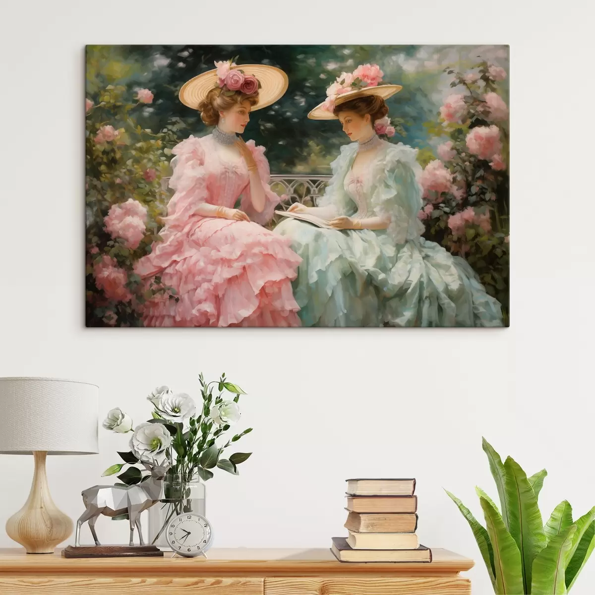 Schilderij Twee elegante vrouwen in pastelkleurige jurken zitten in een tuin tussen de rozen, lezen een boek en genieten van een vredige sfeer. Art. s42582