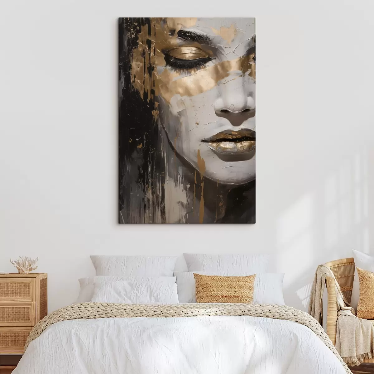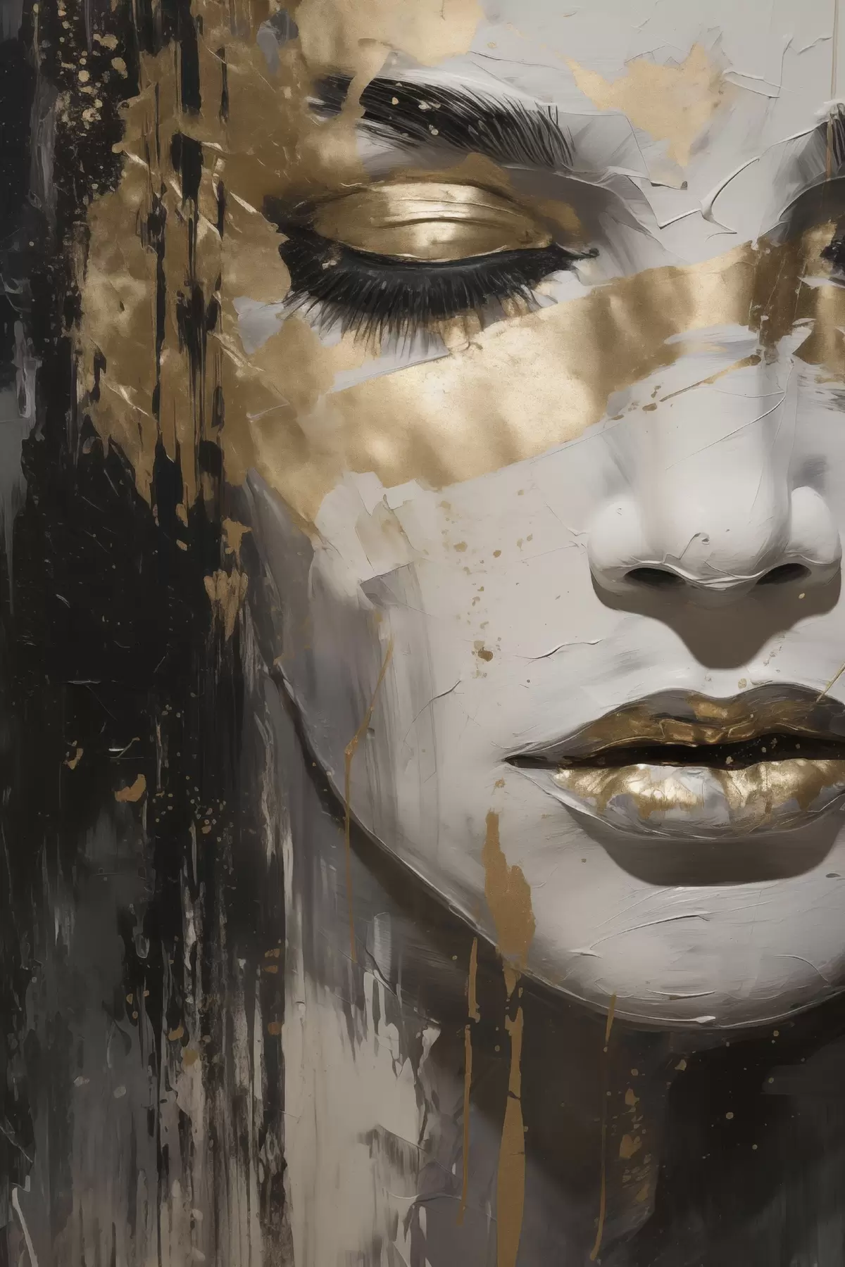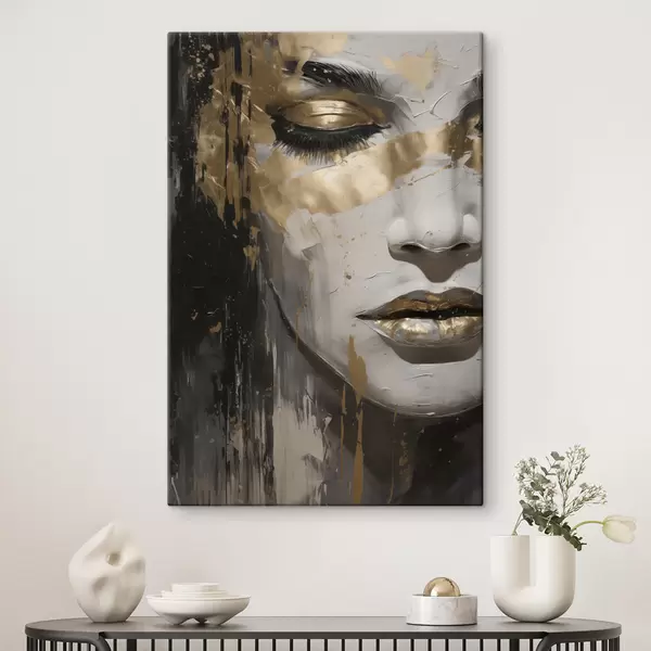 Schilderij Een abstract portret van een vrouw met de nadruk op gesloten ogen en lippen, uitgevoerd in zwart-wit tinten met dynamische warme penseelstreken. Art. s42626