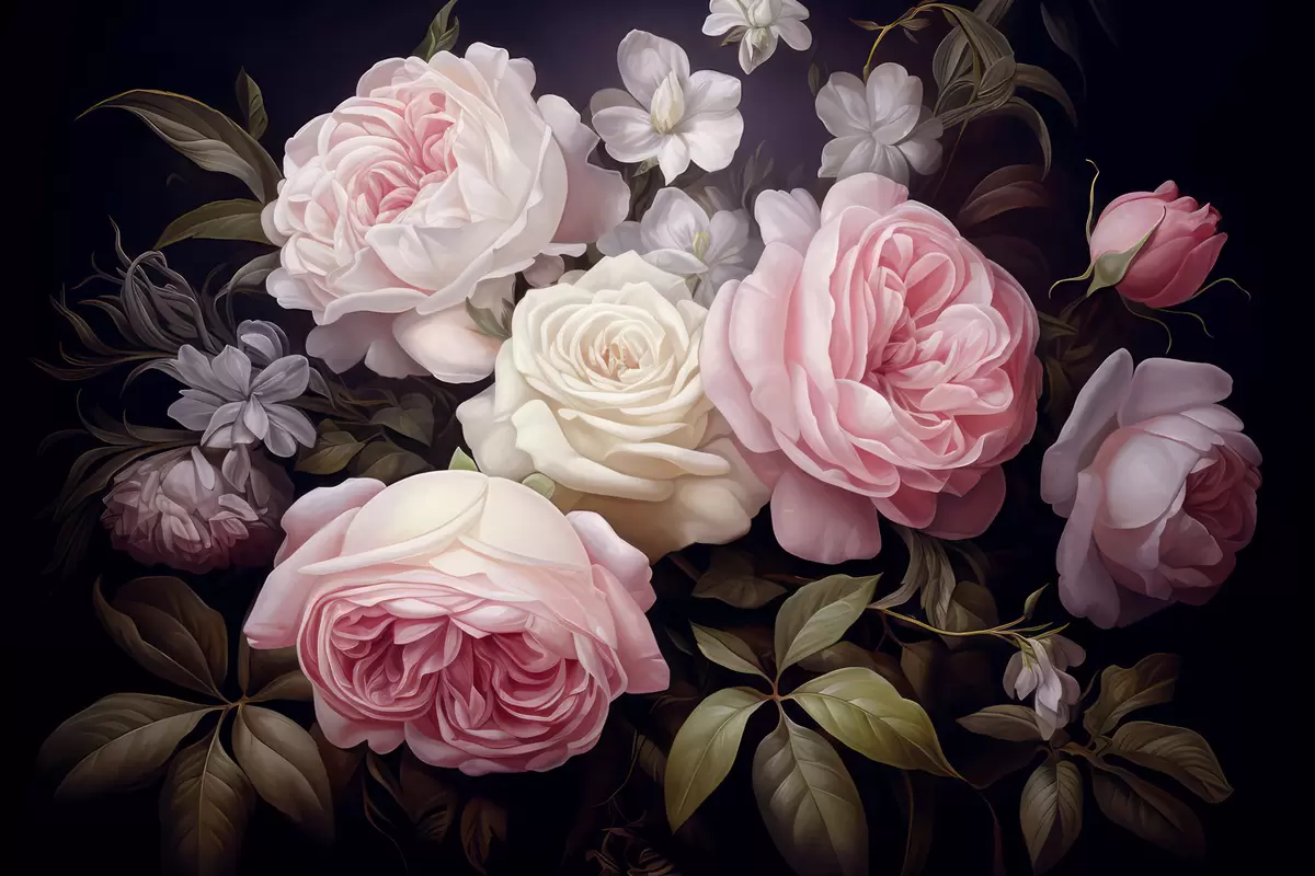 Schilderij Roze en witte rozen gerangschikt met delicate witte bloemen en groene bladeren tegen een donkere achtergrond Art. s42721