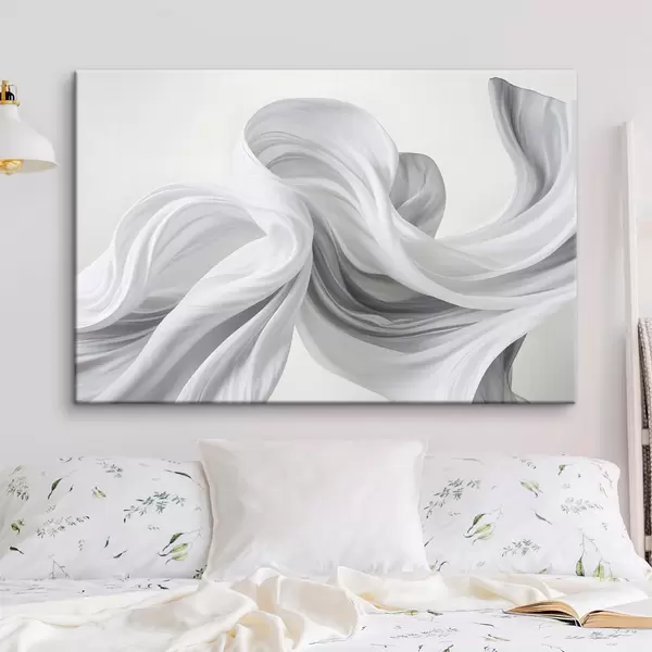 Schilderij Vloeiende witte en grijze stofachtige vormen die wervelen en verstrengelen tegen een lichte achtergrond Art. s42732