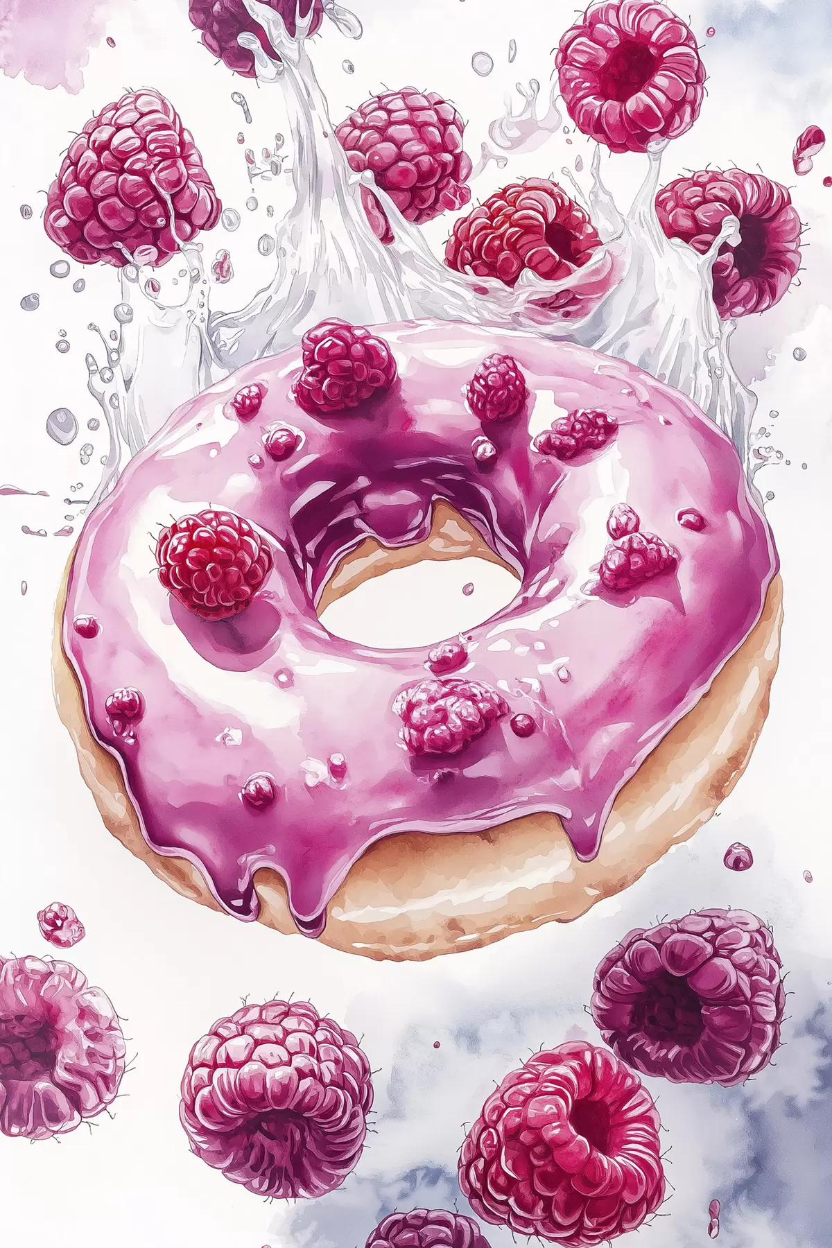 Schilderij Donat met frambozen met roze glazuur, heerlijk toetje, aquarelstijl Art. s42789