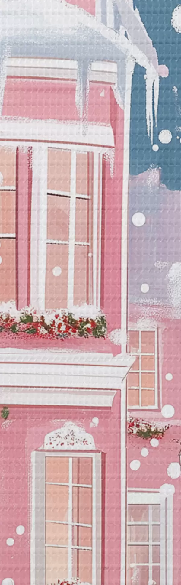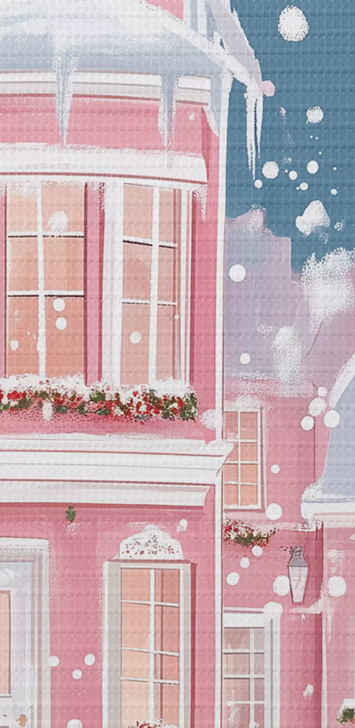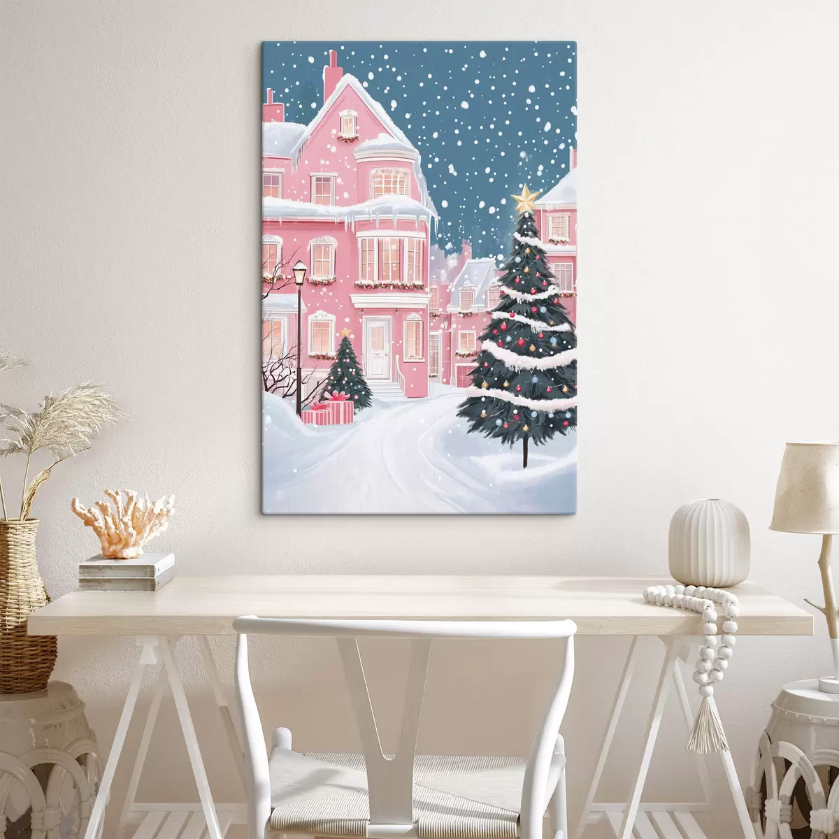 Schilderij Winterstad met roze huizen, kerstbomen, sneeuwvlokken Art. s42792