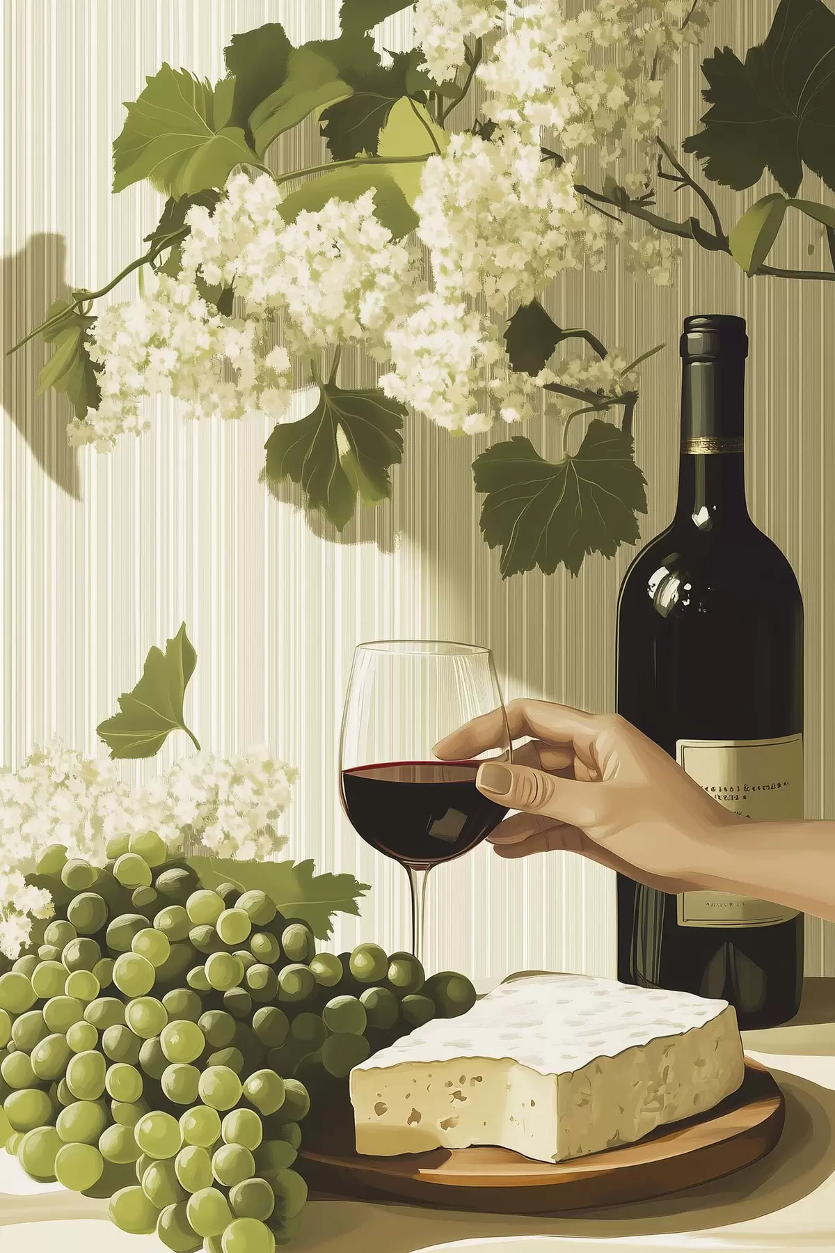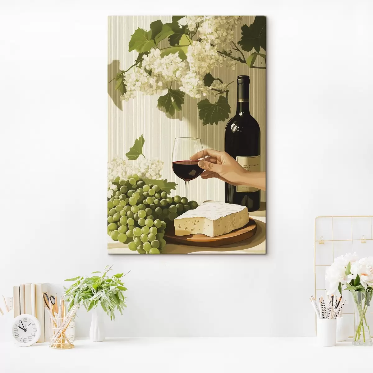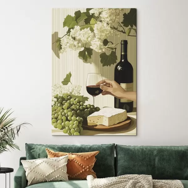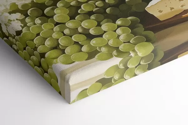 Schilderij Druiven met kaas, fles wijn, vintage stijl, witte bloemen Art. s43052
