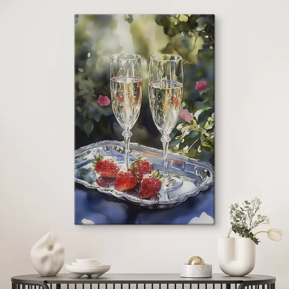Schilderij Feestelijke en sprankelende champagneglazen met aardbeien op het dienblad Art. s43057