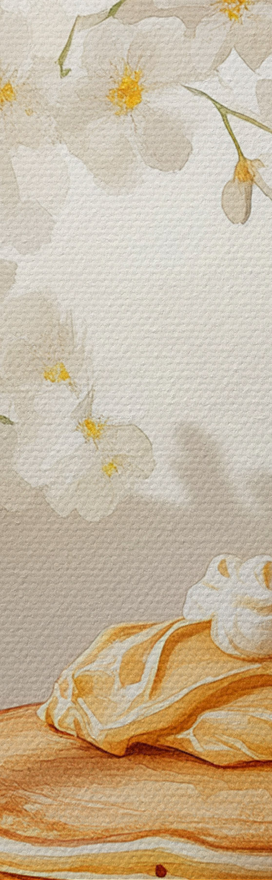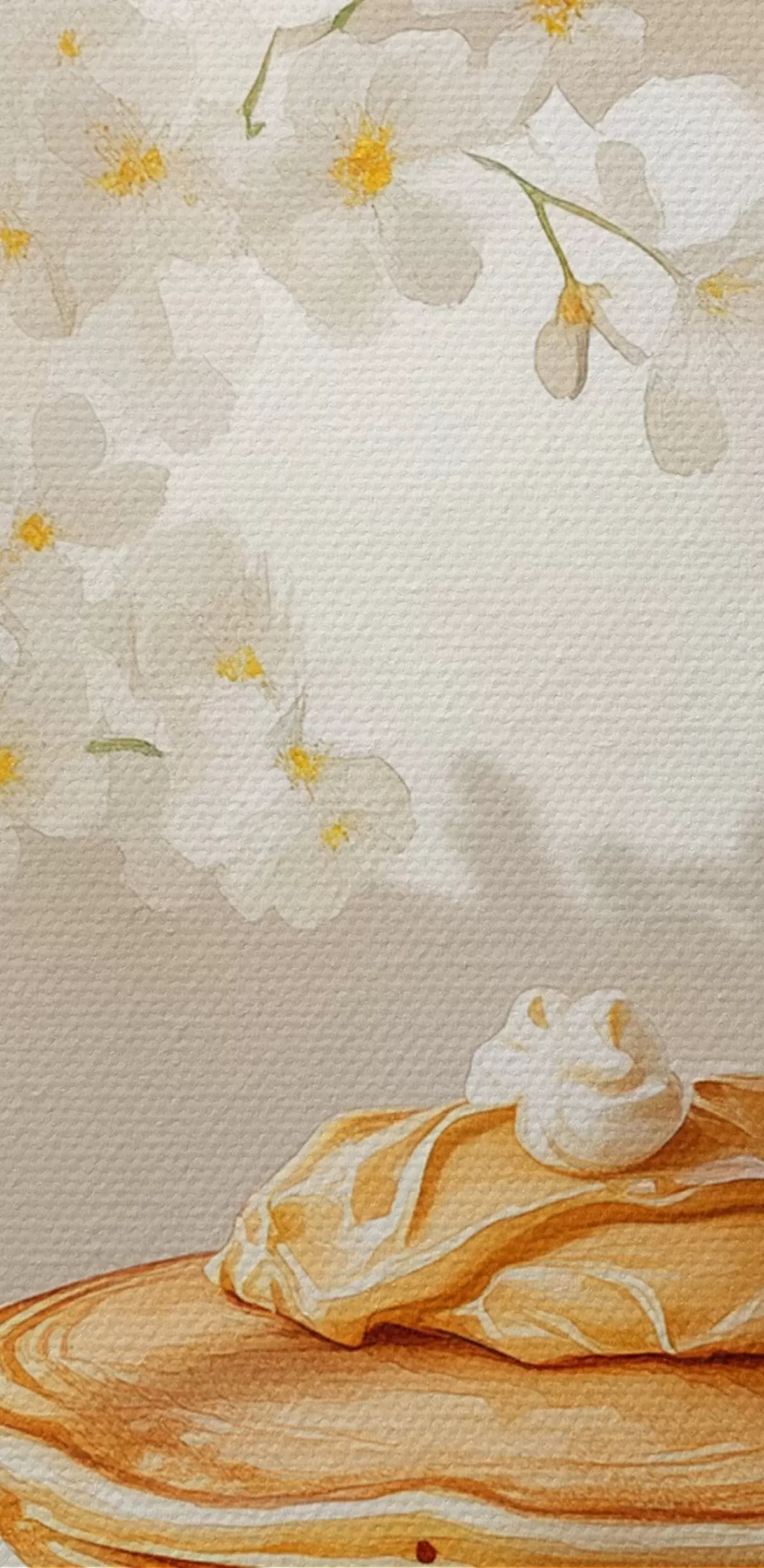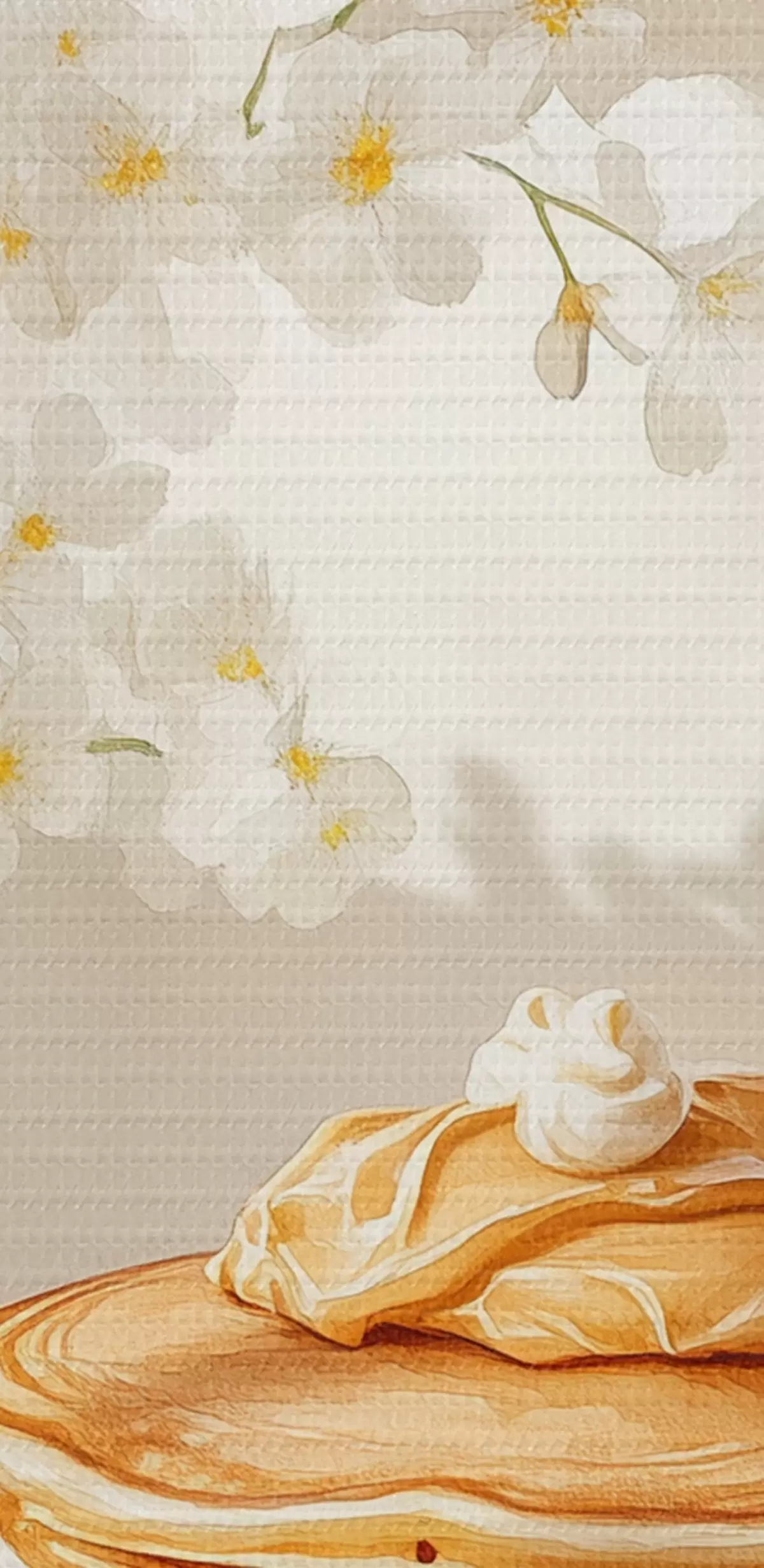 Schilderij Heerlijke pannenkoeken met pindakaas, aquarelstijl, vaas met witte bloemen Art. s43063