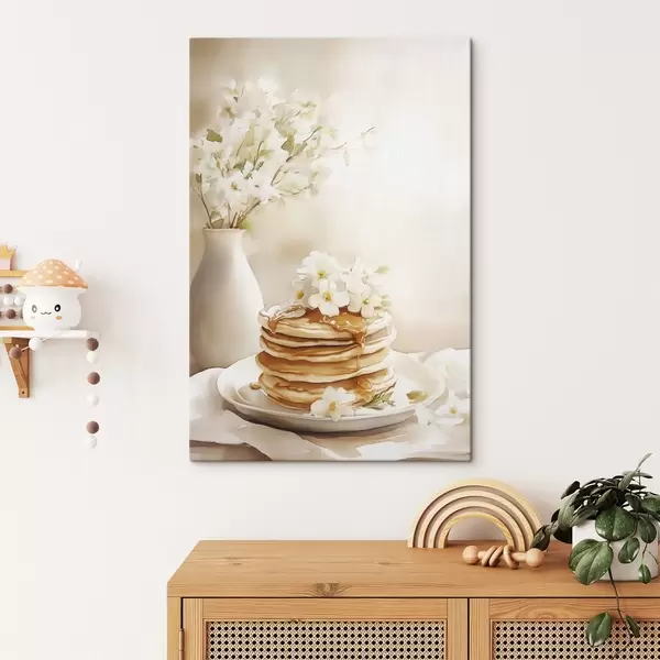 Schilderij Pannenkoeken met pindakaas, witte bloemen, aquarel stijl tekening Art. s43065