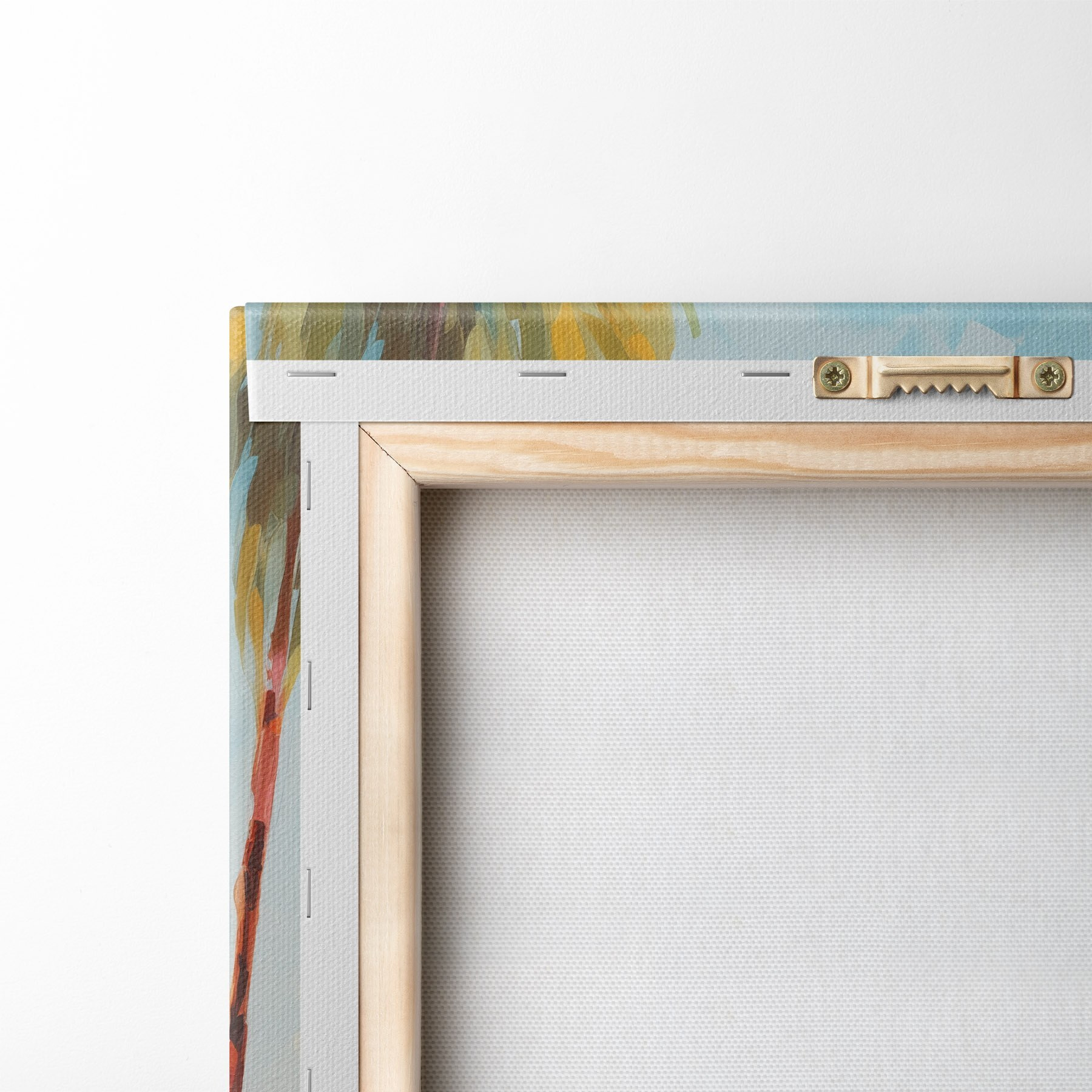 Het schilderij kan direct na ontvangst worden opgehangen. Het schilderij wordt opgespannen op een 2 cm breed houten spieraam.