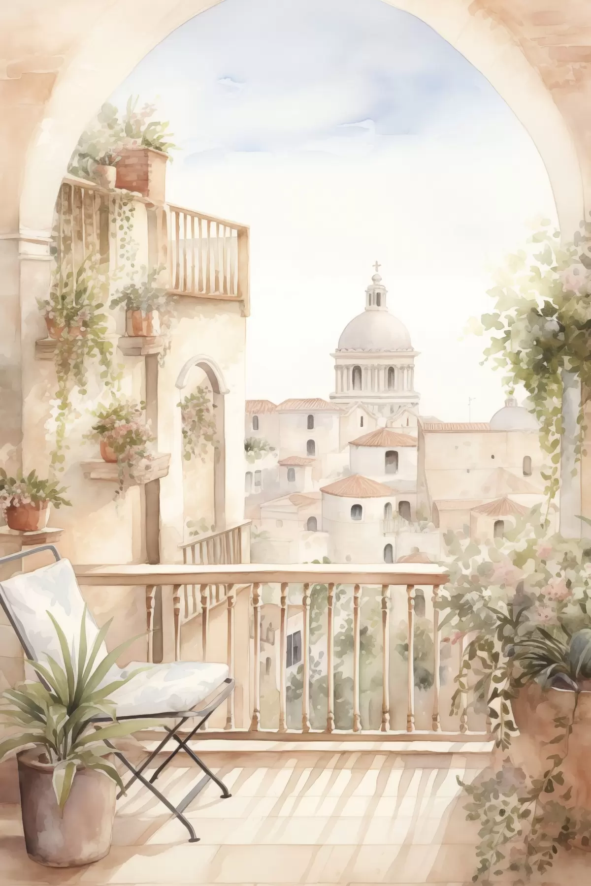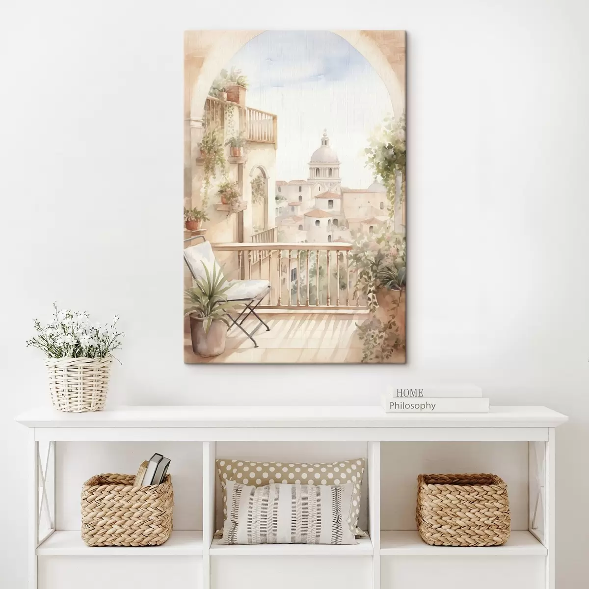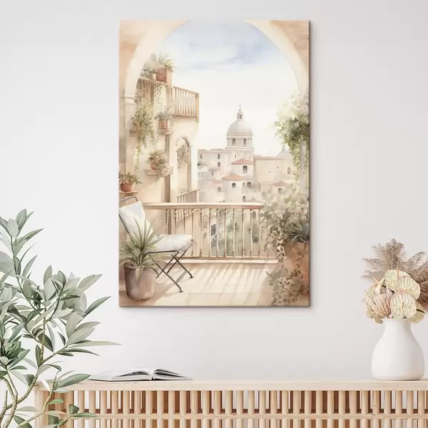 Schilderij Esthetisch zomerbalkon, Spanje, oude architectuur, blomming, aquarel stijl Art. s43180