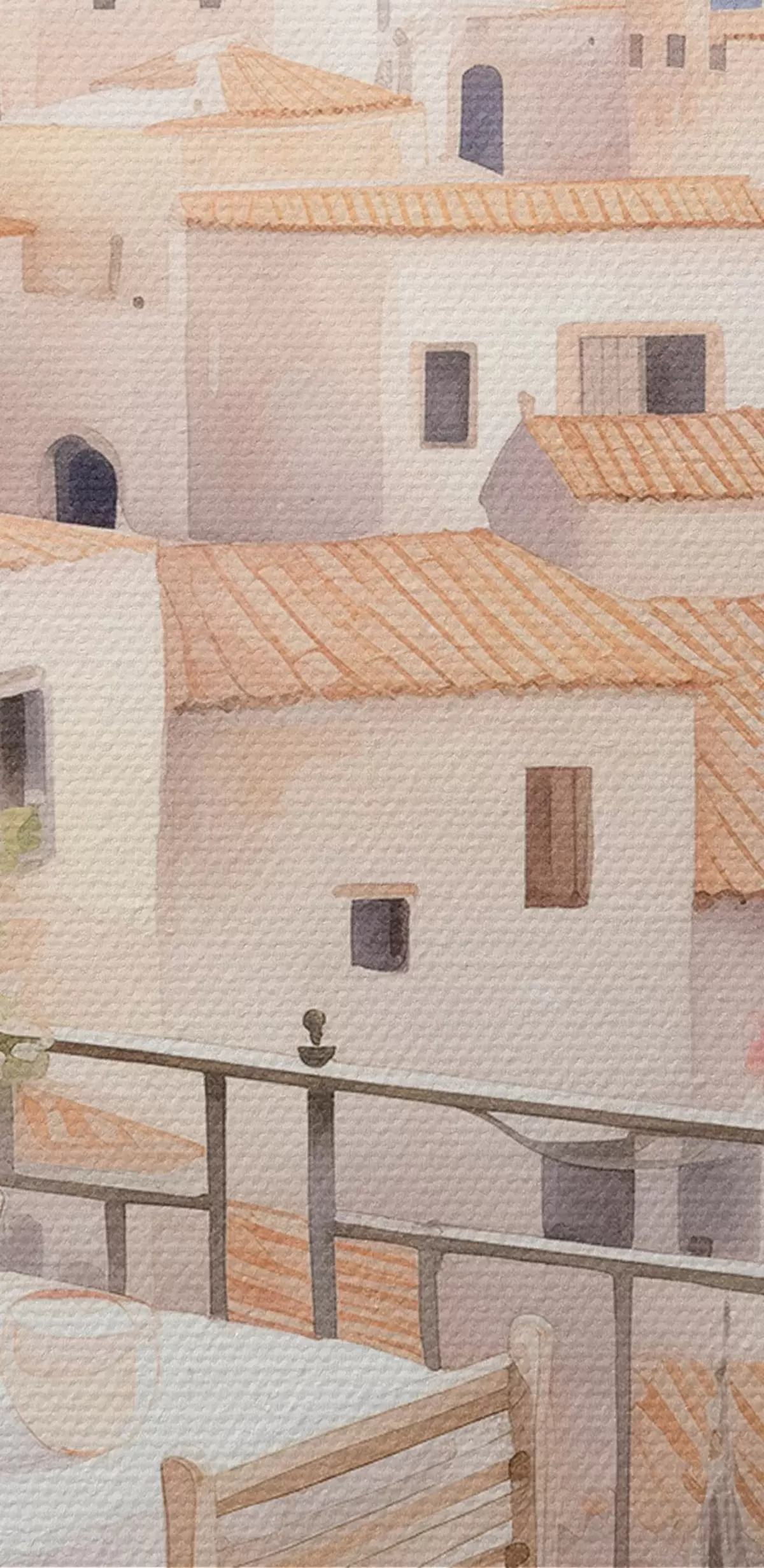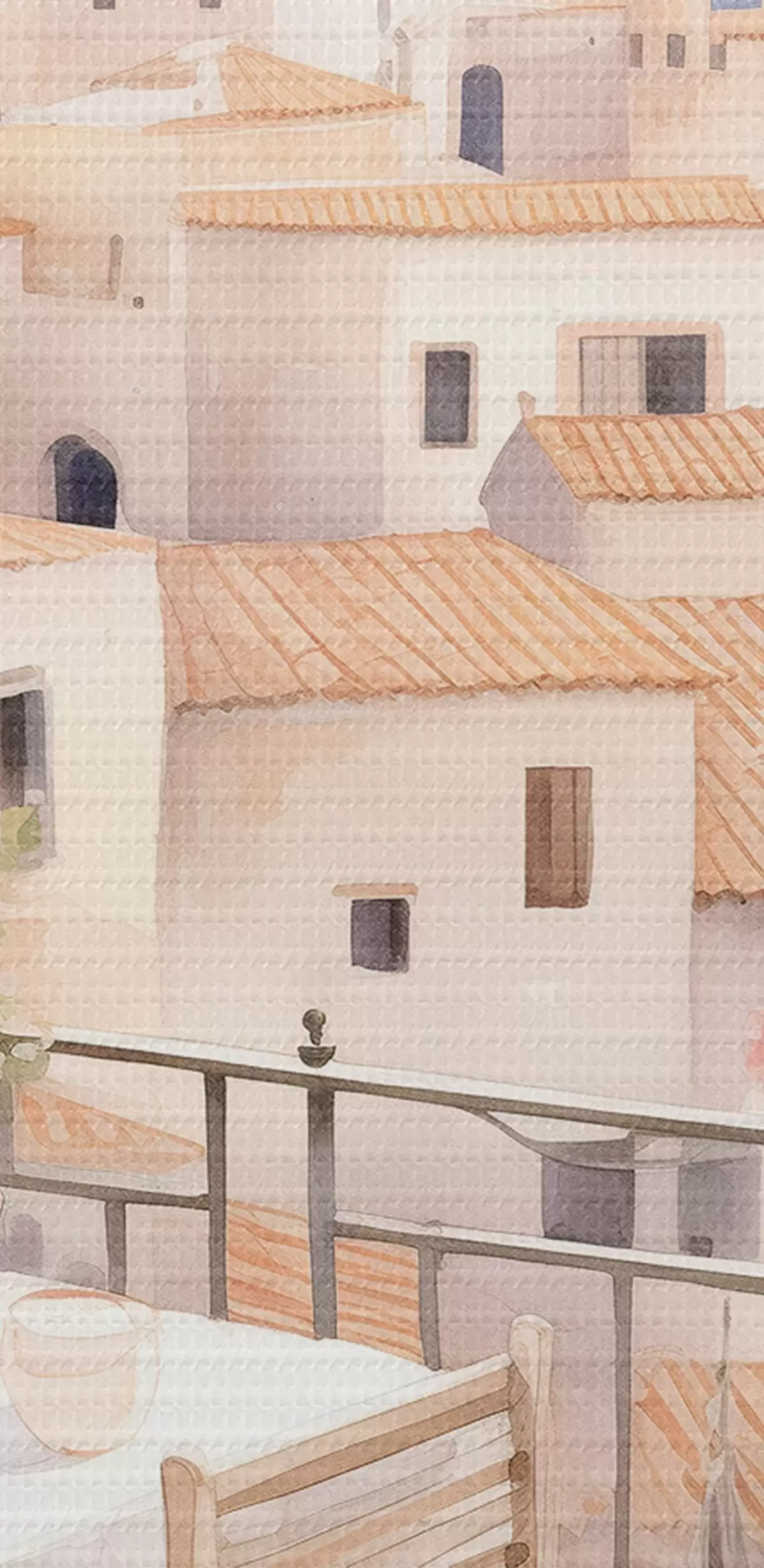 Schilderijen Zonsondergang op het balkon, Italië, architectuur, bloeiende bloemen, aquarel stijl s43184