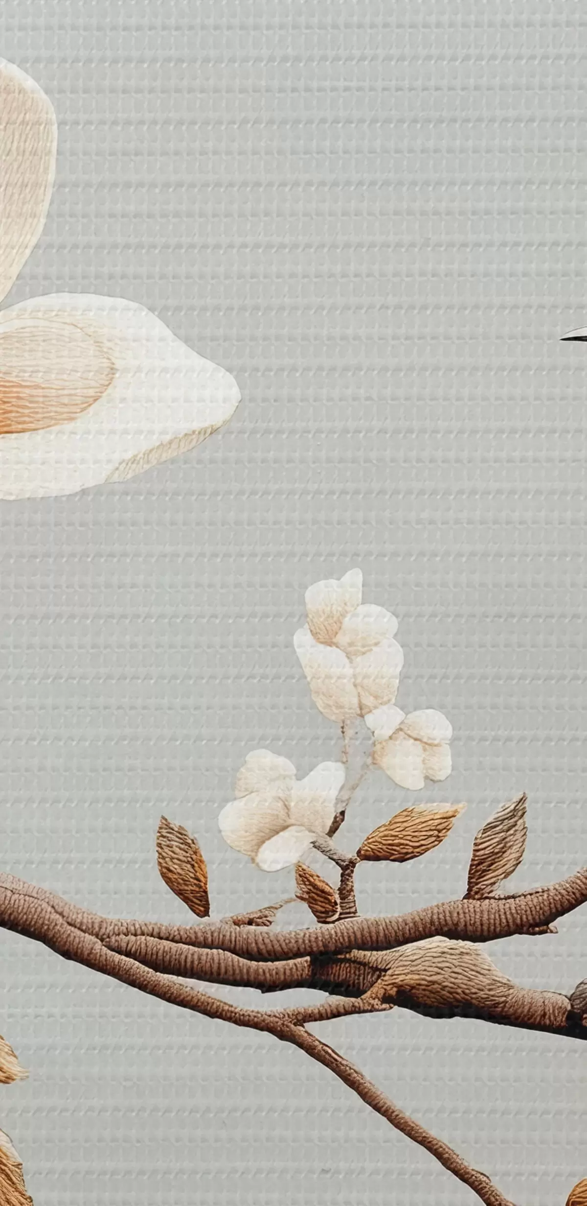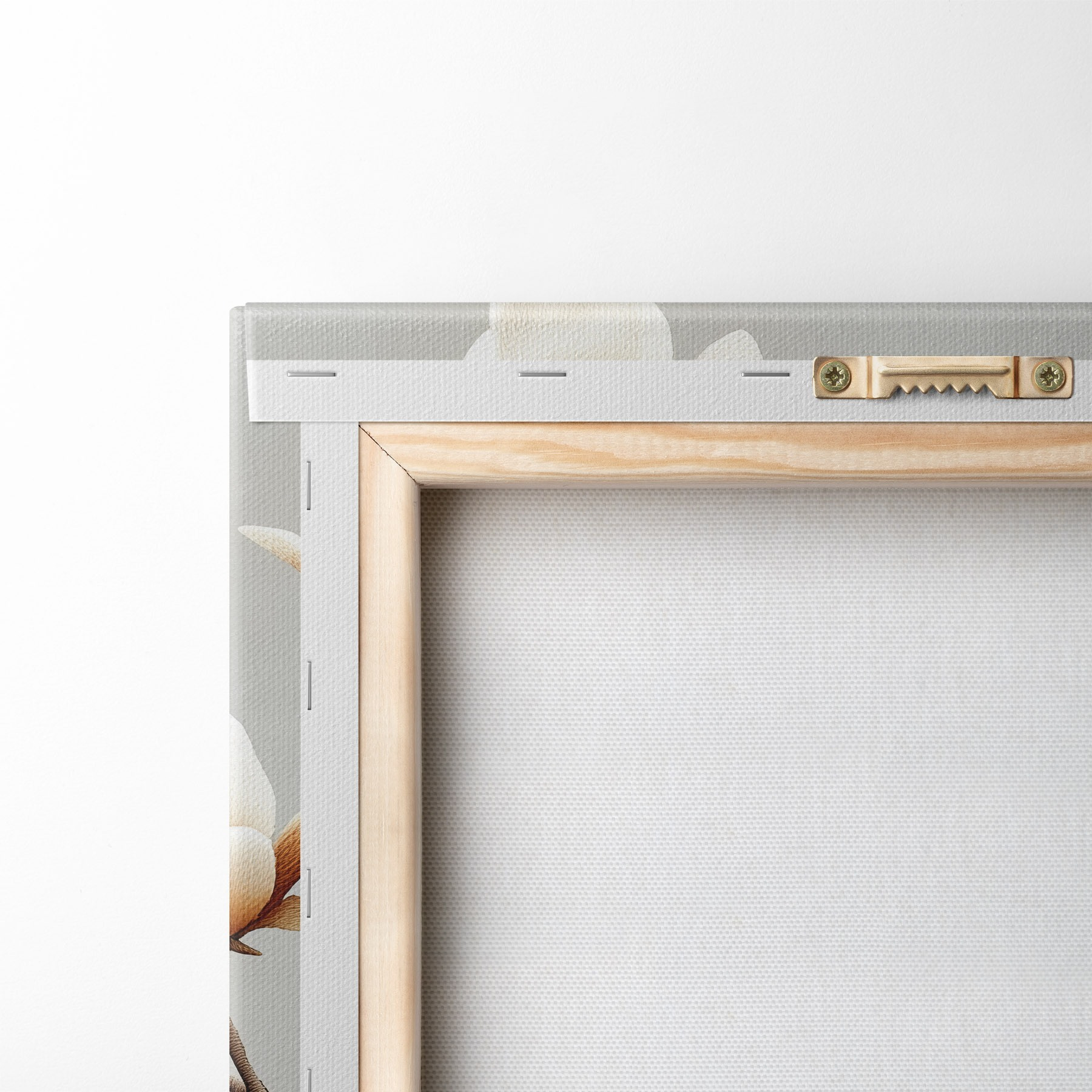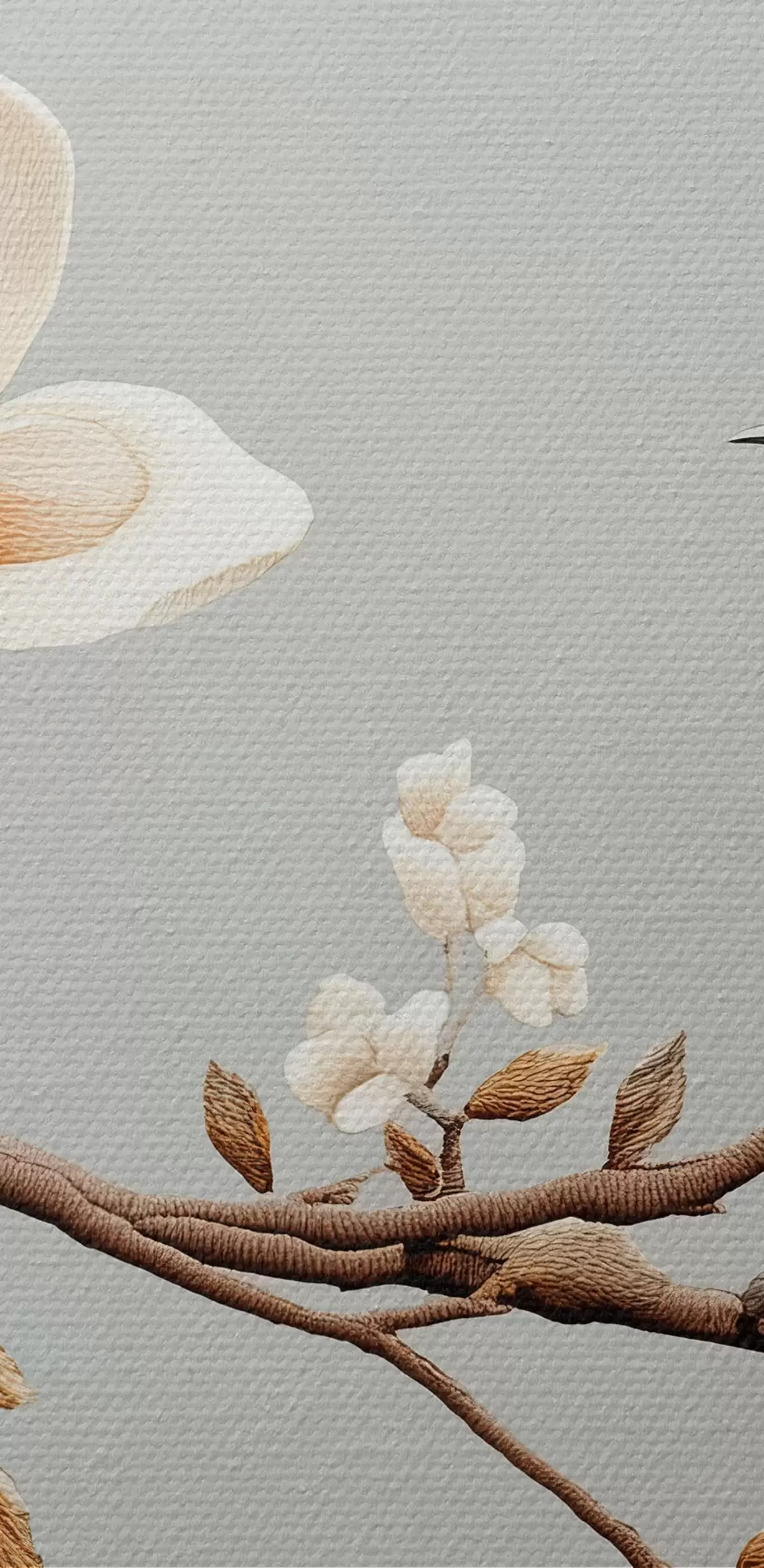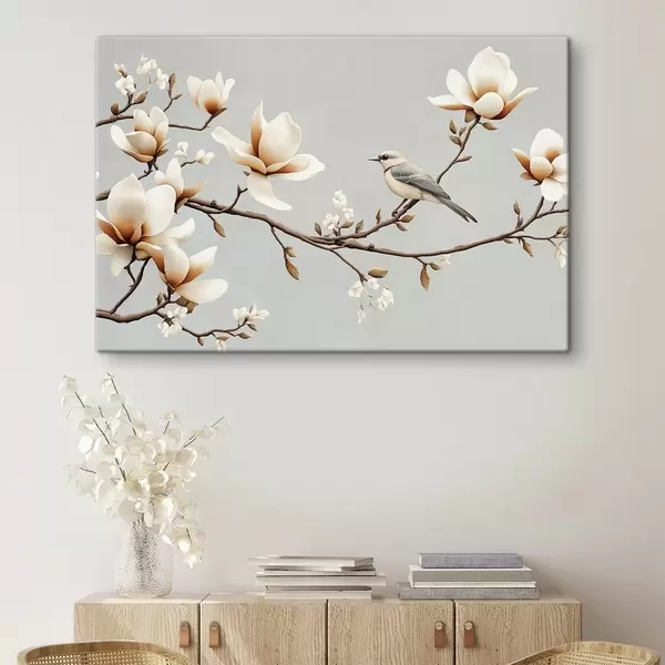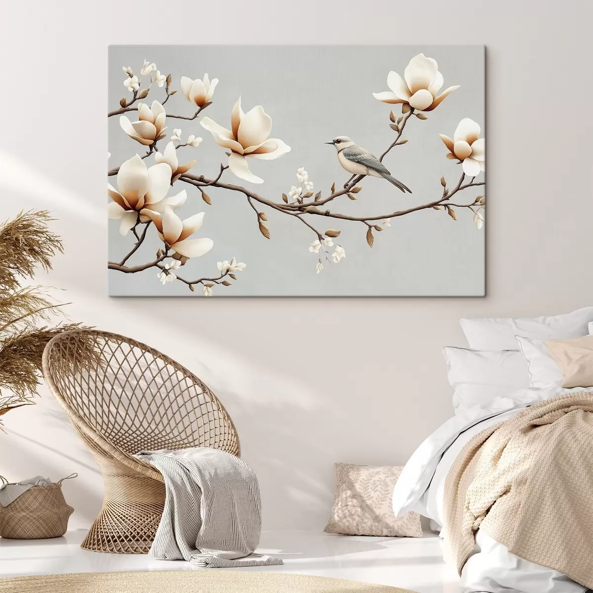 Schilderij Vogel op een tak met magnolia's in zachte pastelkleuren Art. s43320