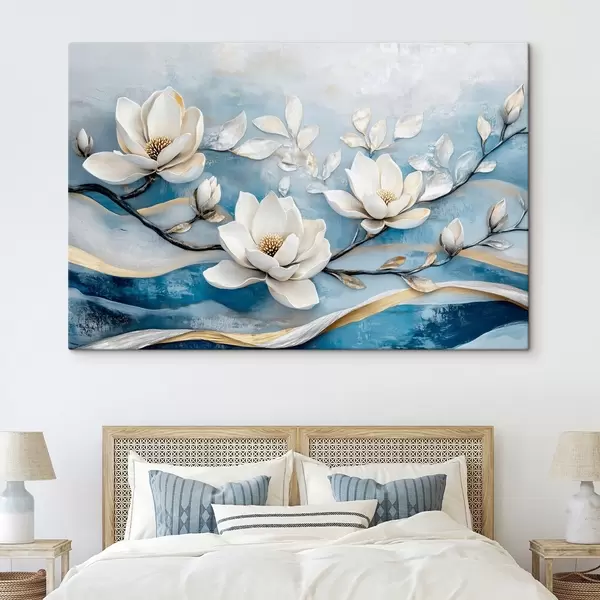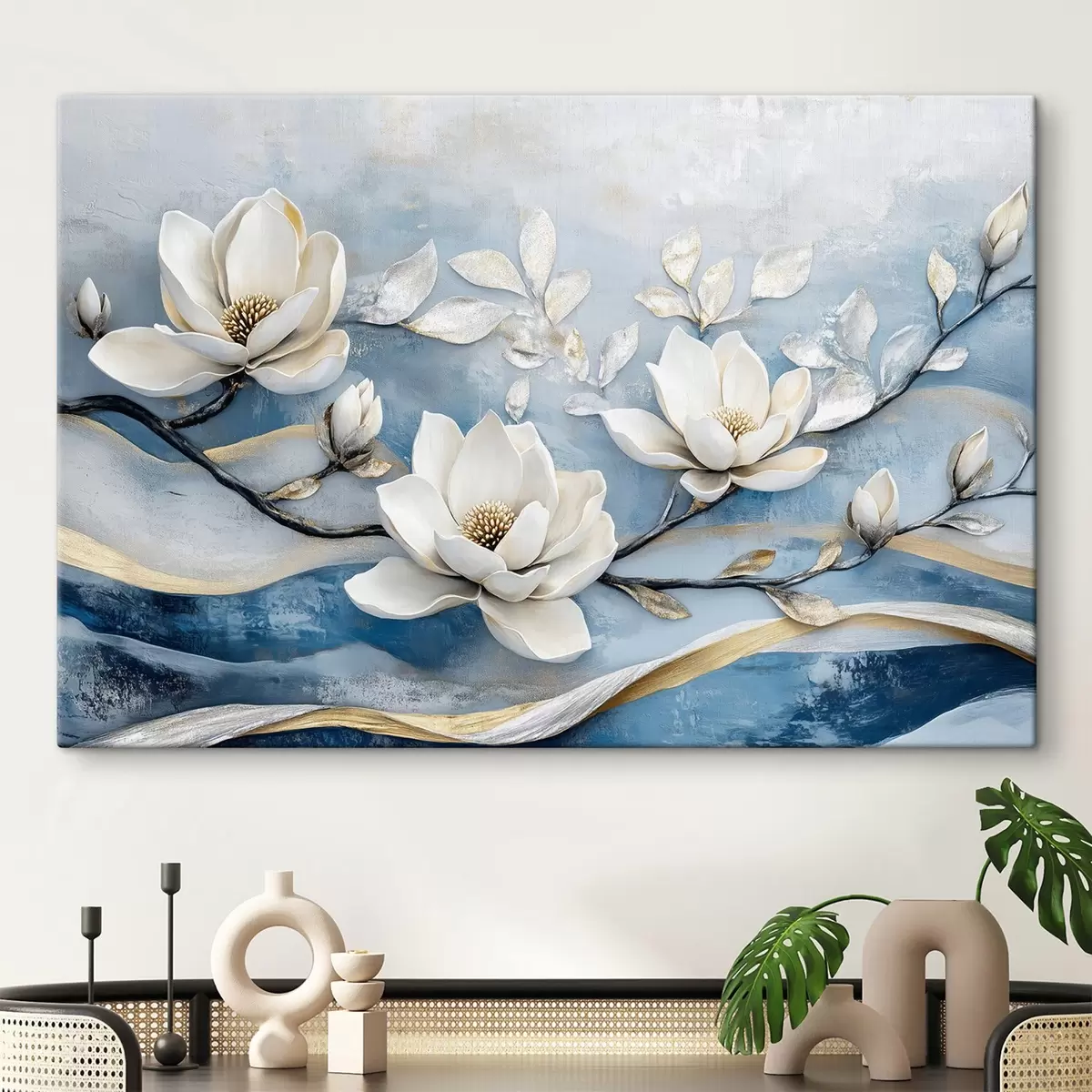 Schilderij Magnolia tak op een abstracte blauw-gele achtergrond Art. s43323